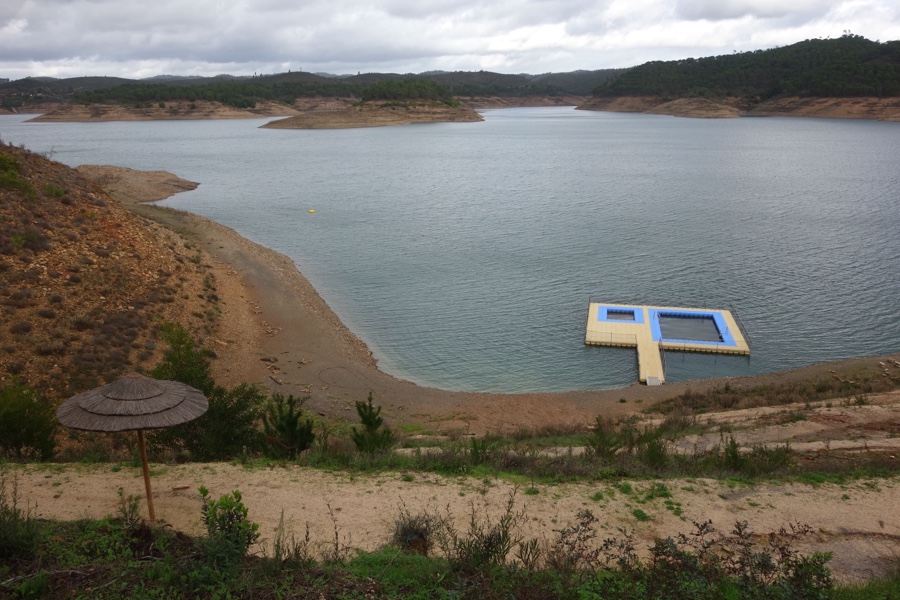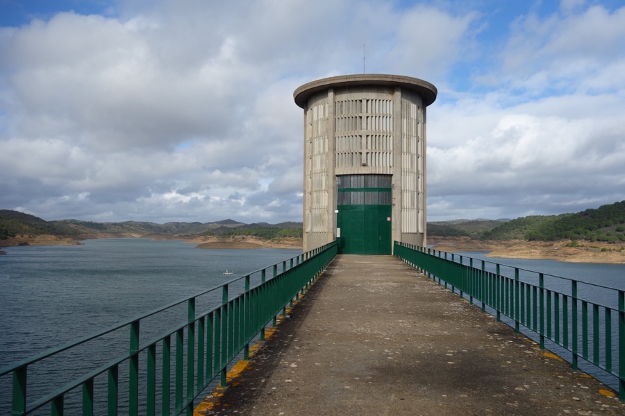 Uns painéis explicativos vão dando a conhecer como funciona a captação, transporte e armazenamento da água do rio Mira para a Barragem, mas só quando subimos e damos de caras com a imensa alfubeira é que começamos a perceber a dimensão da obra e do lugar. O enorme e bruto paredão – com 83 metros de altura – que vínhamos vendo estender-se diante nós dá agora lugar a um belo espelho de água que, não deixando de ser o rio Mira, transforma-se num ápice em lago.