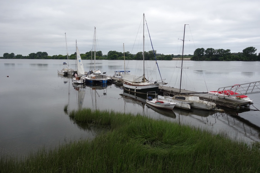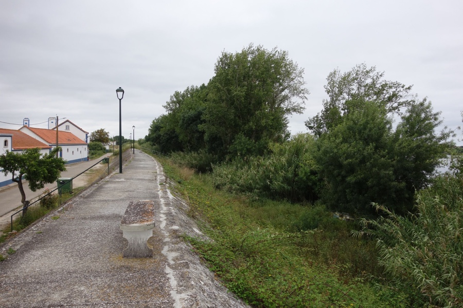 A povoação de Porto de Muge fica logo ali, à saída da Ponte. Seguimos por ela afora, paralelos ao rio. O caminho é sempre plano e a única meia dúzia de escadas que subimos é aquela que nos leva até ao cimo do dique. Pois é, esta caminhada tem como facto curioso o de ser em grande parte efectuada sobre o dique que protege a passagem da água do rio nos períodos de cheias, o que é muito frequente no Tejo. Ou seja, esta obra de engenharia hidráulica propõe-se a tapar a passagem da água, daí que seja também conhecida como “tapada”.