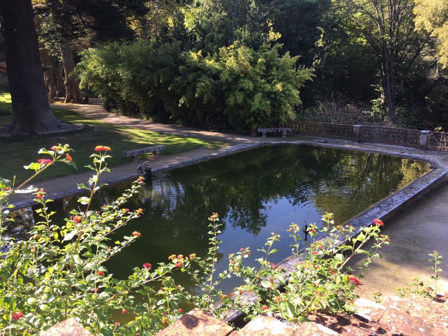 Prosseguindo neste patamar superior, que nos transporta até uma das alas do Palácio – onde se avista a torre da capela -, são inúmeros os lagos e tanques que vamos vendo desfilar abaixo, no patamar inferior. O parque foi construído em socalcos e desenvolve-se em vários patamares, sendo a água um elemento essencial. Aliás, uma linha de água que o atravessa é fundamental, não tanto como elemento cénico, passando despercebida antes de se adentrar a mata, mas mais como elemento estruturante e funcional. A cascata que dá para o lago maior, por exemplo, é por ela alimentada.