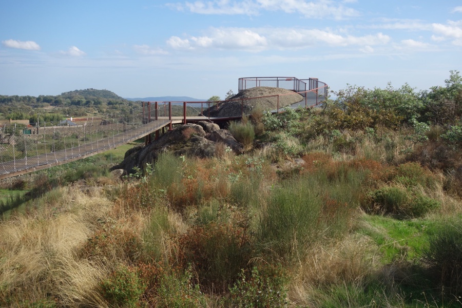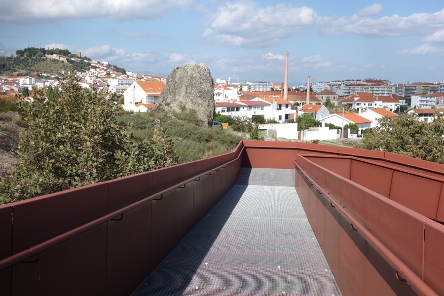 A designada “Chave do Barrocal”, o início do percurso pelo parque, é um passadiço em ferro que ziguezagueia até nos deixar num ponto mais elevado com uma vista para a cidade. O Mirante Castelo Branco faz-nos ver como estamos tão perto da malha urbana, com o Outeiro da Cardosa e seu castelo no cimo e as chaminés da antiga zona industrial logo ali. Aliás, alguns dos monumentos da cidade foram construídos com o granito do Barrocal.