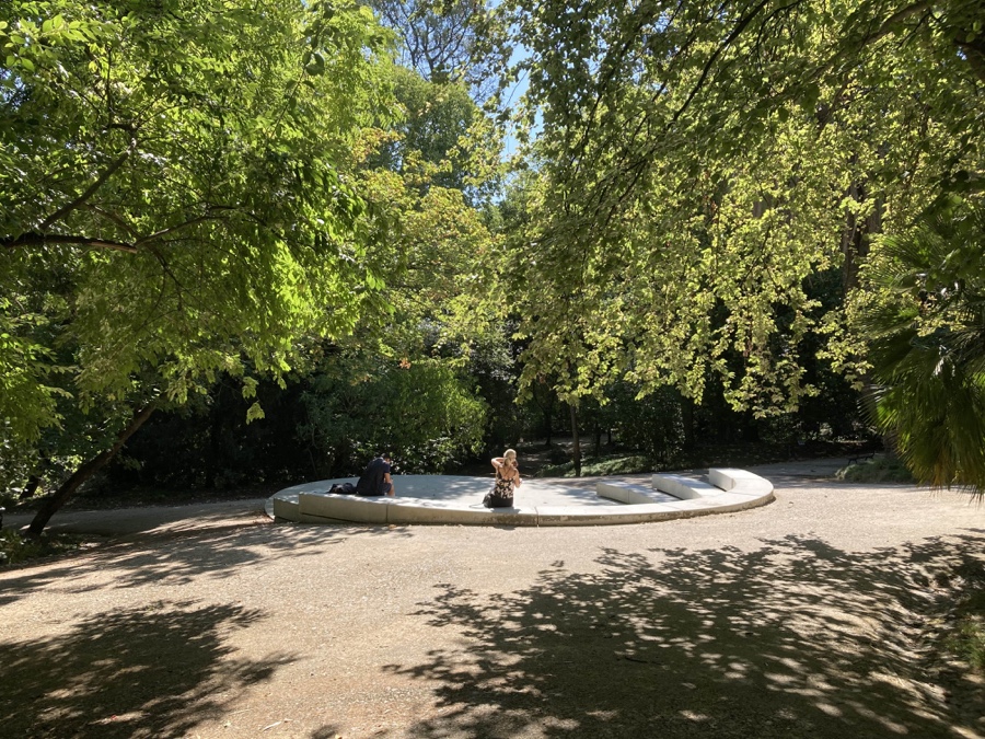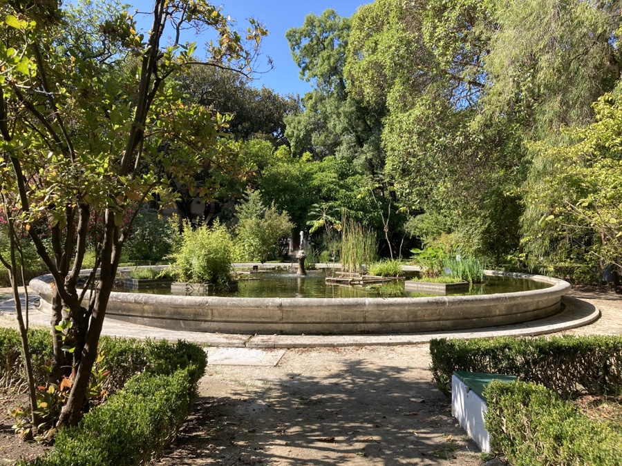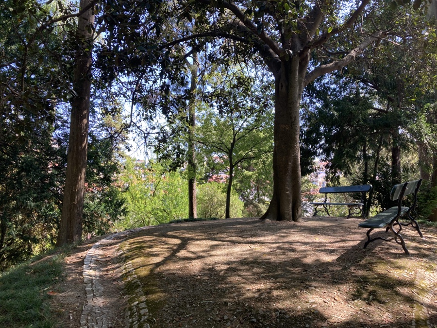Passamos ainda por mais um lago, desta vez o Lago de Baixo, com belos reflexos do arvoredo que o rodeia – a água como elemento romântico, característica de uma época que continuamos a apreciar. Este lago foi objecto de restauro em 2018, altura em que foi inaugurado o Anfiteatro Fernando Catarino, situado um pouco mais acima. Não faltam bancos espalhados por todo o Jardim, mas as bancadas alvas deste novo anfiteatro são igualmente um convite irresistível a uma pausa para introspecção e contemplação.