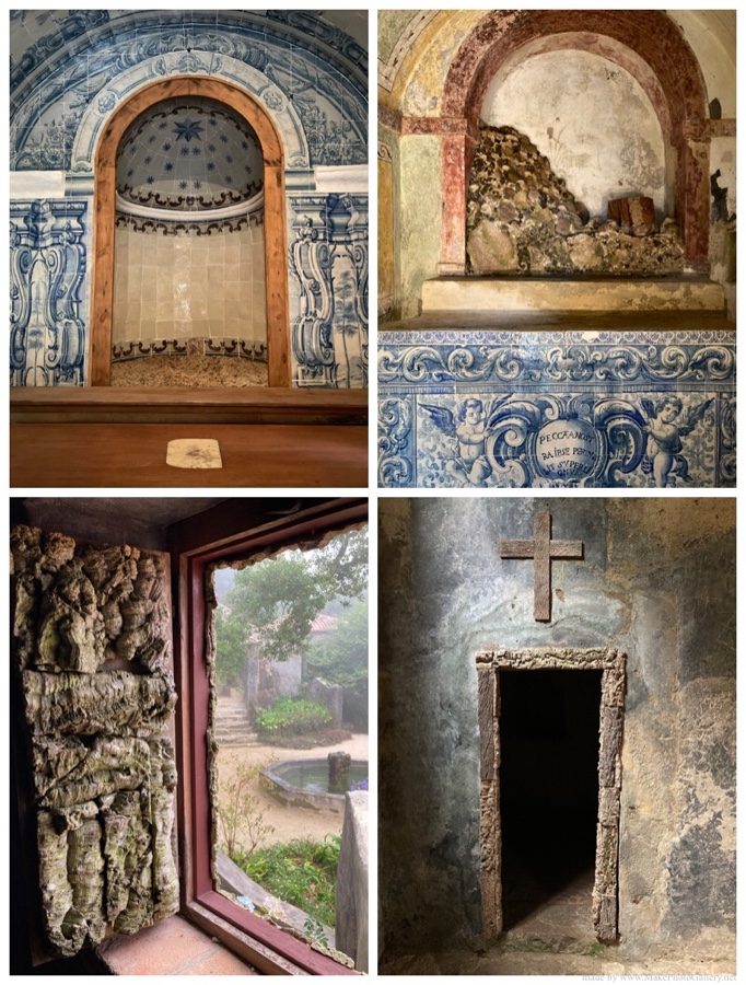 Bastam estes passos iniciais para darmos conta da simplicidade da construção e sua decoração, a tal que muitas vezes confundimos com pobreza. As paredes e degraus aproveitam a rocha e são nelas escavados, as grandes rochas servem como elementos decorativos, existindo aqui e ali um ou outro embrechado ou azulejo, e os tectos são revestidos a cortiça, bem como as portas e janelas. Eis o porquê do Convento dos Capuchos ser também conhecido por Convento da Cortiça. Não há aqui qualquer ostentação e o recurso a um material menos nobre vem ao encontro da vida singela e dos votos de pobreza que os frades franciscanos que aqui habitaram escolheram para si. Há que acrescentar, porém, que a cortiça acaba por ser útil e prática – vinda dos sobreiros da mata que envolve o Convento, é um bom elemento para fazer face à humidade e ao frio, ao mesmo tempo que serve de decoração.