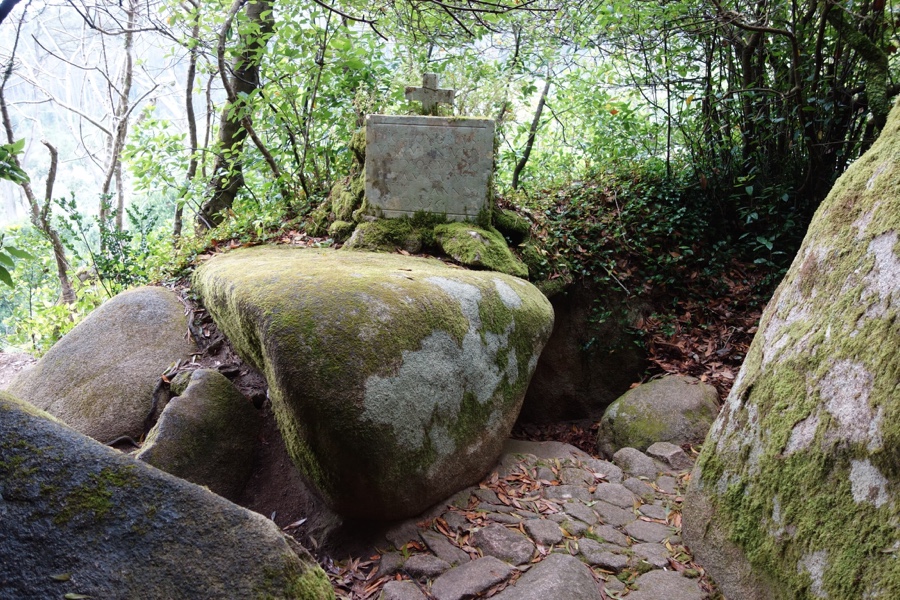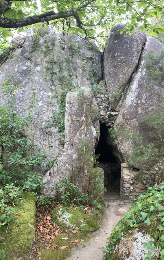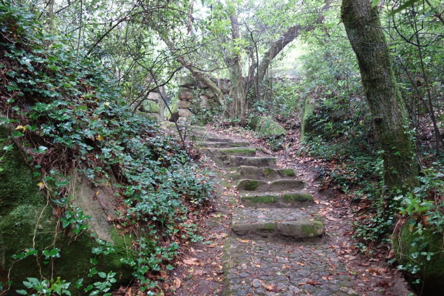 Depois de caminharmos uns metros pela mata, adentramos no espaço conventual pelo Terreiro do Sino, com várias cruzes a marcar o lugar e dois caminhos como entradas constituídos por um par de degraus nada óbvios junto a uma rocha, como se do acesso a um esconderijo se tratasse. A simbologia, uma constante no Convento, começa logo aqui: os dois caminhos – iguais – representam o livre arbítrio para nos guiar até ao lugar desejado, que fica logo atrás de um formoso rochedo.