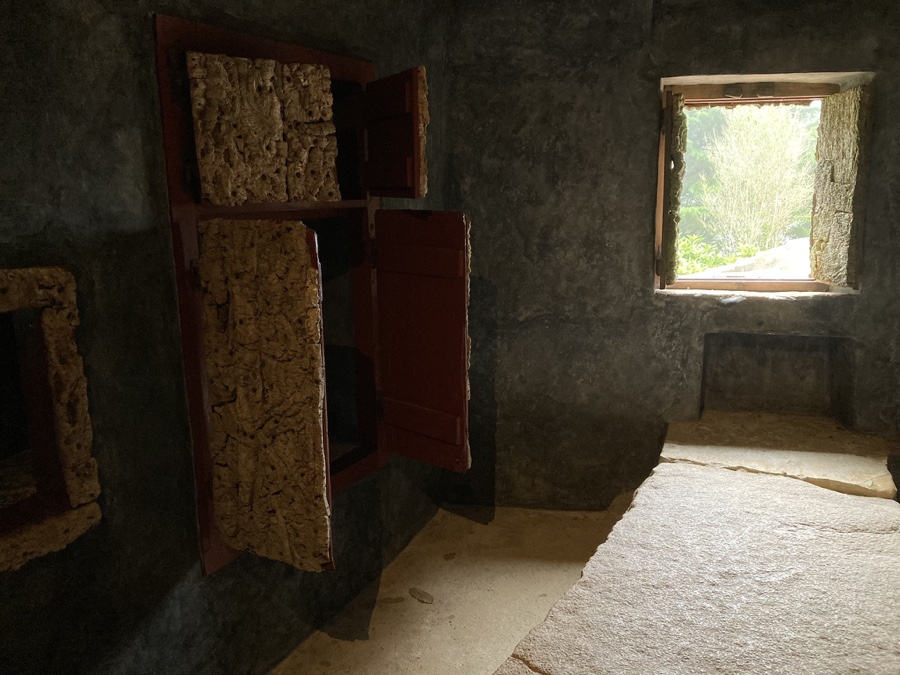 Do Claustro voltamos a entrar no conjunto de edifícios, agora para acesso a outras divisões. A Sala do Capítulo fica logo à entrada à direita e era o lugar onde a comunidade de frades se reunia. À esquerda, a cozinha e o refeitório com a laje de pedra que servia de mesa. Não resistimos a espreitar da janela de cortiça para o exterior do Claustro e mata.