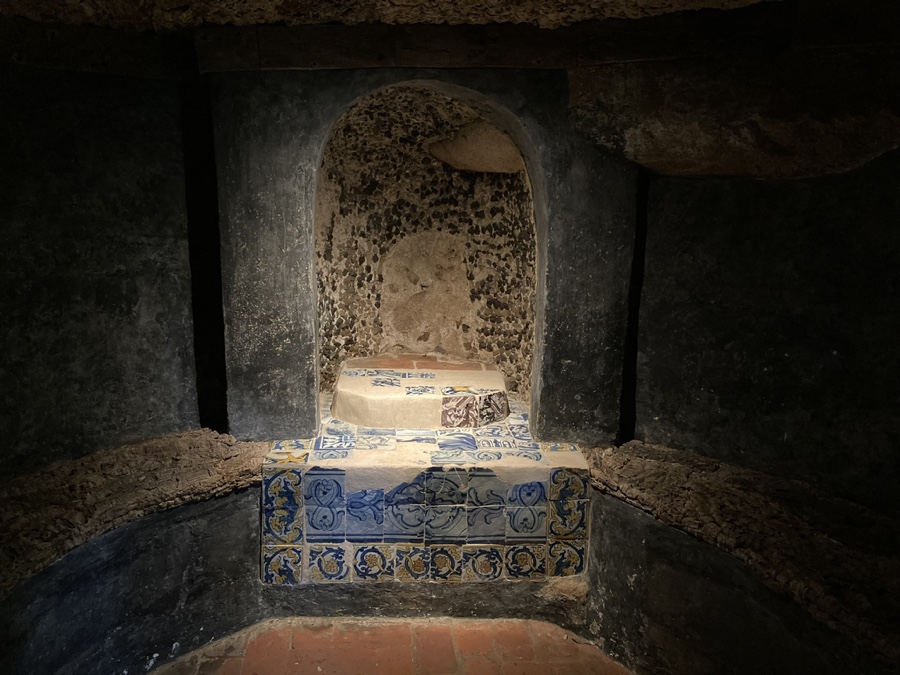 Já dentro do edifício conventual, no pequeno átrio à direita encontramos a Capela da Paixão de Cristo, com azulejos a azul e branco do século XVIII, e à esquerda a Igreja. Esta igreja é uma preciosidade no que respeita à sua plena integração com o lugar, escavada na rocha e dela se aproveitando para ganhar uma qualidade cénica ímpar. Vemos aqui o brasão da família Castro, a qual ofereceu o altar em mármore. Não o percebemos logo, haveríamos de explorar o labirinto mais tarde, mas nas traseiras da igreja há uma ligação ao Coro Alto e à sacristia que, por sua vez, dão acesso às demais divisões do Convento.