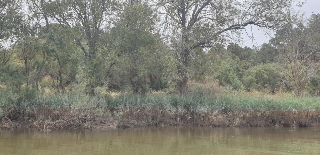 A jornada vai serena, mas de repente entra um vento frontal intenso que interrompe toda a paz. A nossa atenção agora é toda dedicada ao esforço de remar e de nos mantermos junto à margem direita, menos fustigada pelo vento. O rio, mais encaixado, vai serpenteando e algumas curvas protegem-nos do vento.