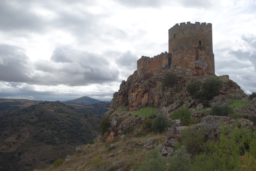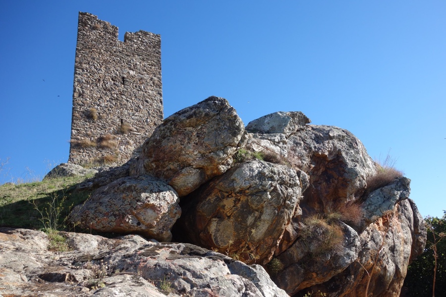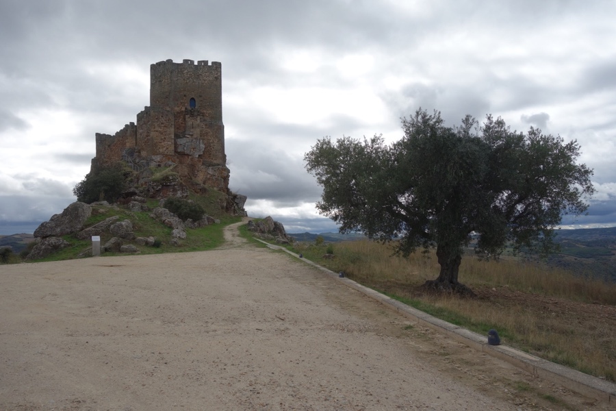 Isolado na paisagem, à semelhança do de Algoso, a torre do castelo românico templário é uma ruína elegante e incrível na forma como se consegue equilibrar na escarpa granítica onde assenta. Chegamos até ela depois de galgarmos sem dificuldade pelas traseiras da praça onde fica a igreja da aldeia. Nesta torre de forma quadrangular que teria pelo menos três pisos não se chega a perceber a sua entrada. Na verdade, o acesso a ela fazia-se por uma porta elevada, à qual se acedia por uma escada amovível. A torre de menagem, o elemento que chegou aos nossos dias e o único que faz perceber aos leigos que aqui existiu um castelo, ficava no meio do seu antigo pátio, o qual, por sua vez, estava cercado por uma muralha. Ao redor, como se quisessem espreitar a bela paisagem que os rodeia, restam parte dos dois cubelos em ruína, duas torres quase circulares.