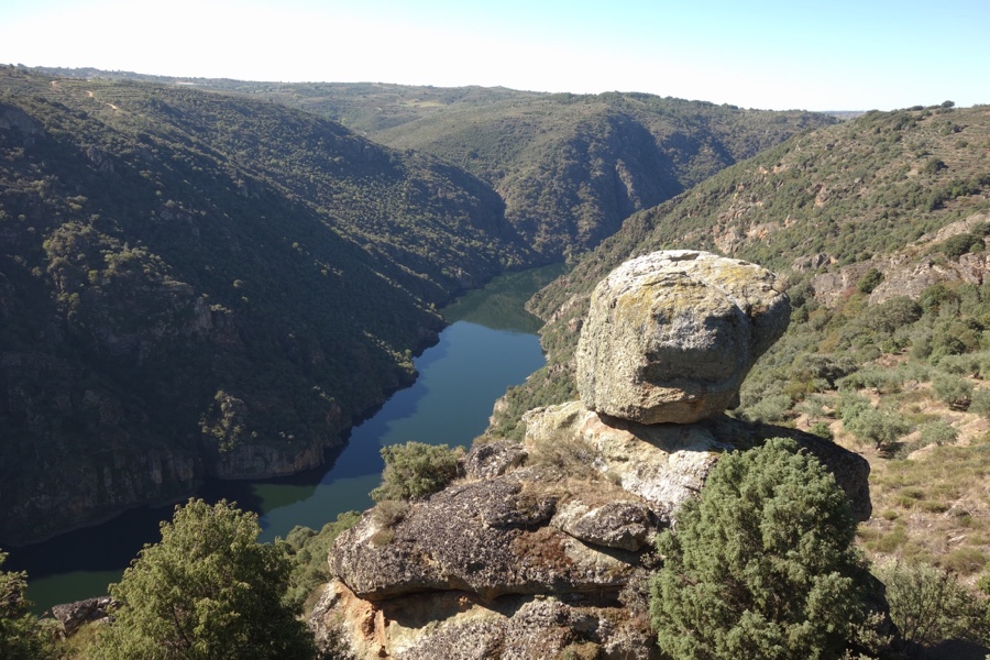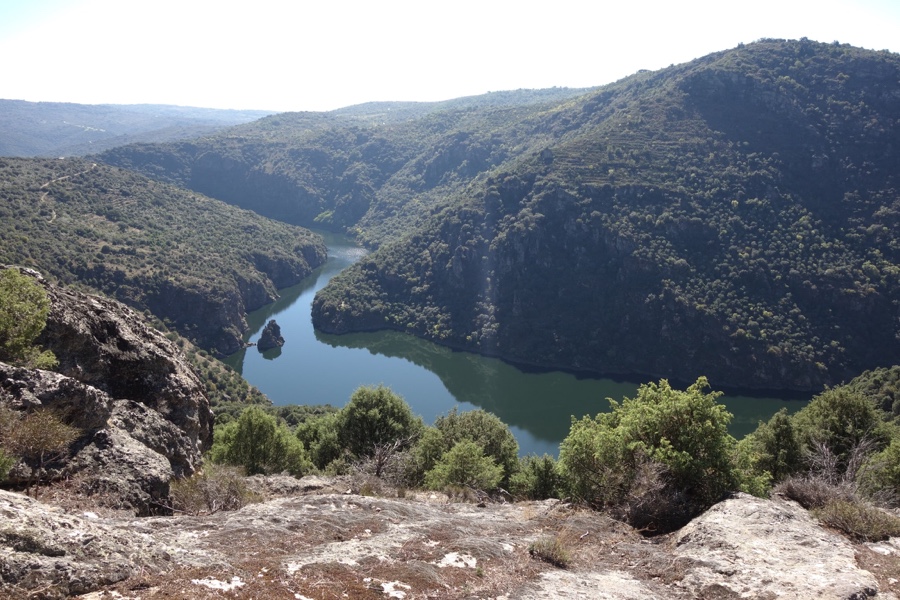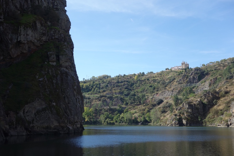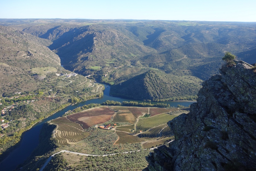 Iniciando a norte, logo temos o prazer de pisar o ponto mais oriental do território português, o lugar onde o sol nasce primeiro. Pertencente à freguesia de Paradela, o miradouro de Penha das Torres abre o apetite para a luminosidade deste pedaço de água azul profundamente encaixado entre fragas selvagens que nos acompanhará por toda a jornada. Empoleirados – em segurança – nuns blocos de granito a 675 metros de altitude, bem por cima da espanhola Embalse de Castro Collado, é aqui que assistimos ao Douro a entrar em Portugal.