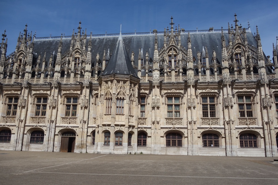 E rumamos ao Palácio da Justiça, um imponente e monumental edifício carregado de uma profusão de gárgulas e pináculos, típico do gótico flamejante, possuindo também aspectos renascentistas. Fundado pelo rei em 1499 para servir de tribunal – L’ Échiquier -, era então Rouen capital da justiça normanda, acabou transformado em parlamento da Normandia em 1515. Diz que o interior merece ser visto, mas estava fechado no dia da nossa visita.