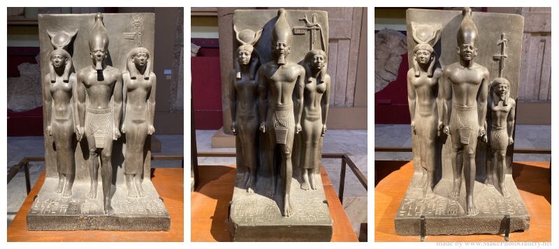 Tríades de Menkauré, Hathor e Deusa – Encontradas no Templo de Menkauré, em Guiza, mostram o rei que construiu a terceira pirâmide de Guiza entre duas figuras femininas, à direita Hathor, coroada com o disco solar entre dois cornos de vaca, e à esquerda personificações de diferentes nomes (províncias) do Egipto com os seus símbolos escritos acima da cabeça. O rei Menkauré usa a coroa branca do Alto Egipto e o shendyt-kilt, pretendendo usufruir da ressurreição e da fertilidade de Hathor através das oferendas eternas.