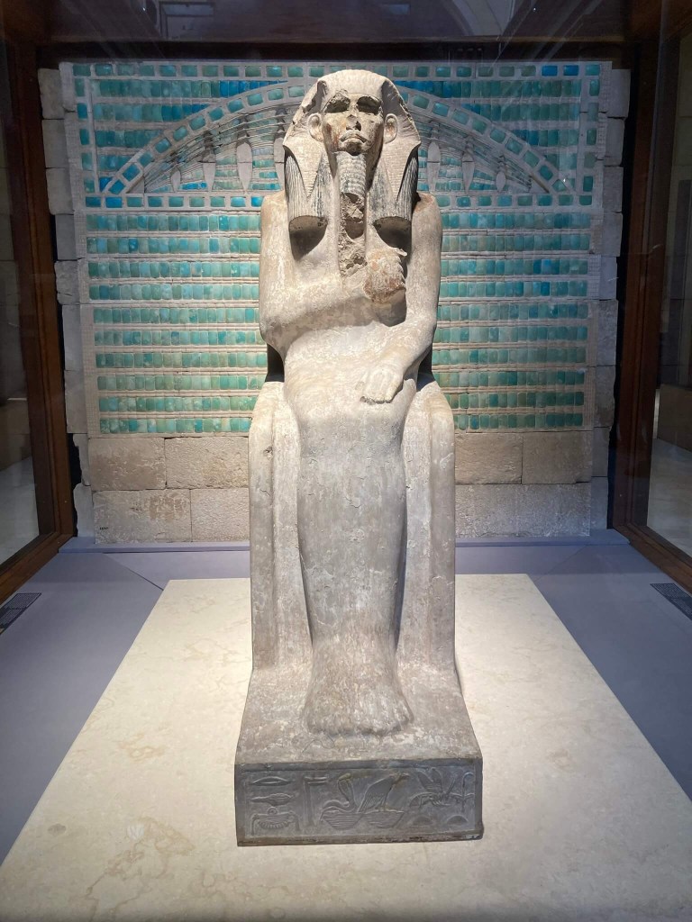 Estátua de Djoser – Esta estátua do antigo faraó da 3ª dinastia, Império Antigo, é a mais antiga estátua em tamanho real, encontrada em 1925 junto à sua Pirâmide Escalonada de Sakara. Sentado, é aqui apresentada com o painel de faiança azul que estaria na sua pirâmide, pretendendo significar o paraíso eterno e não apenas um propósito decorativo.