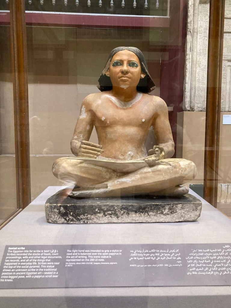 Estátua do Escriba Sentado – Da 5ª dinastia, século 24 a.C., esta estátua foi encontrada num túmulo em Sakara e representa um escriba desconhecido. Os escribas tinham por função relatar as comidas armazenadas, os procedimentos da corte, os impostos e taxas e situações do dia a dia, bem como escrever os documentos legais. Estavam, pois, próximos do topo da pirâmide social. Este é representado sentado, com as pernas cruzadas, posição comum na representação destas figuras, e numa das mãos, super detalhada, segura um papiro enrolado. Mais uma vez, os olhos desta estátua são impressivos. Esta figura está representada na nota de 200 LE.