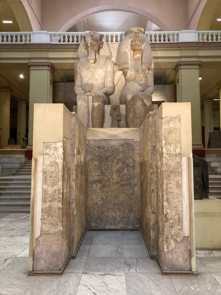 Estátua Colossal de Amenhotep III e Tiye – Esta escultura imensa em pedra calcário do rei Amenhotep III e sua mulher e três das suas filhas domina o hall central do Museu Egípcio e é considerada a maior estátua representando um par de figuras. Foi consideravelmente restaurada e as cabeças estão intactas, mas numa das suas laterais conseguimos perceber os veios da pedra quebrados, espécie de cicatrizes ainda com pontos, e espanta que após tantos milénios ainda consiga manter-se íntegra e conservada. Veio de Madinet Habu, em Luxor.