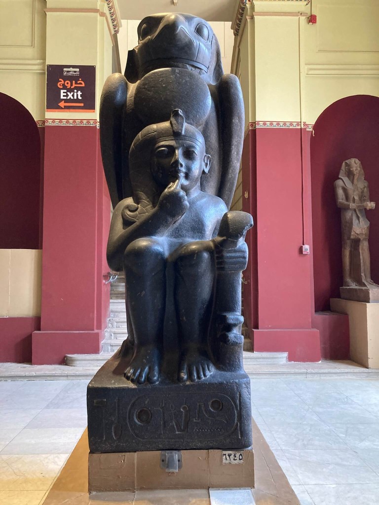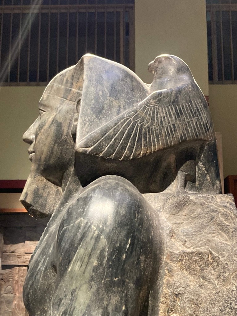 Mas a obra de arte que mais cativou foi a estátua de Ramses II com falcão. É linda e perfeita, delicada na pedra imaculada em que foi trabalhada. A parte posterior, nas costas de Ramses II, possui apenas uma pena longa de falcão para nos arrebatar por completo.