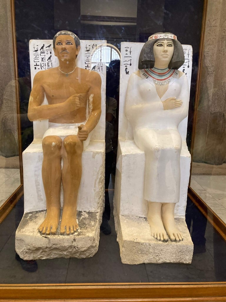 Estátuas do príncipe Rahotep e sua mulher Nofret – Encontradas em 1871 na sua mastaba em Meidum. Rahotep seria filho do rei Senefru e irmão do rei Khufu. Esta obra deixa-nos ficar a pensar sobre elementos interessantes, como a cor de cada personagem: mais escura a pele do homem e mais clara a da mulher – há quem defenda que é porque eles sairiam mais à rua, mas o mais provável é que não seja assim, antes uma convenção da arte egípcia. E, uma vez mais, destaque para a expressão muito realista dada pelo vidro nos olhos das estátuas.