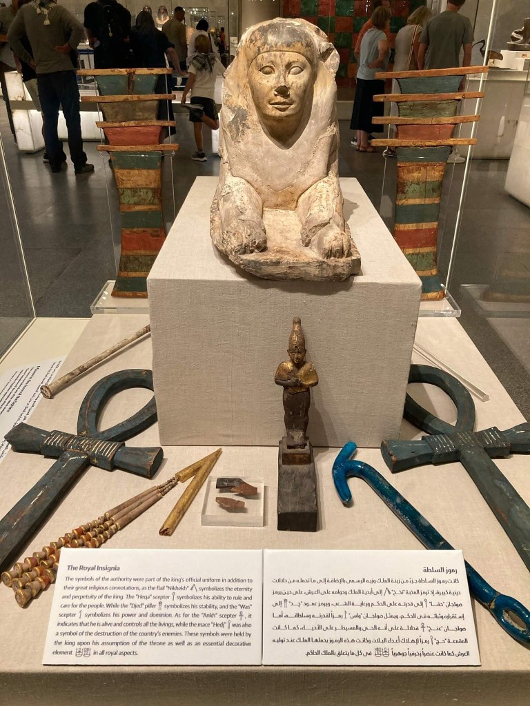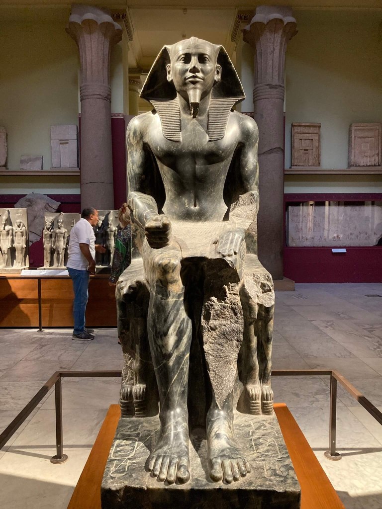 Estátua de Khafré – Esta estátua em pedra de diorito de Tushki, recolhida próximo de Abu Simbel, mostra que o poder de Khafré se estendeu até ao sul do país. Foi encontrada no templo deste rei da 4ª dinastia, junto à sua pirâmide em Guiza e é uma das mais icónicas estátuas do Antigo Egipto. É diante de obras destas que somos gratas pela oportunidade de perceber na perfeição os seus pormenores, como o magnetismo desta pedra robusta e escura e o belíssimo falcão Hórus de asas abertas na parte posterior da cabeça de Khafré, protegendo-o e legitimando o seu estatuto real. O rei Khafré está sentado no trono e usa ainda os nemes de cobra na sua cabeça, também símbolos de realeza e protecção. A flor de lótus e a planta do papiro juntos no símbolo do trono representam a unificação do Alto e Baixo Egipto.