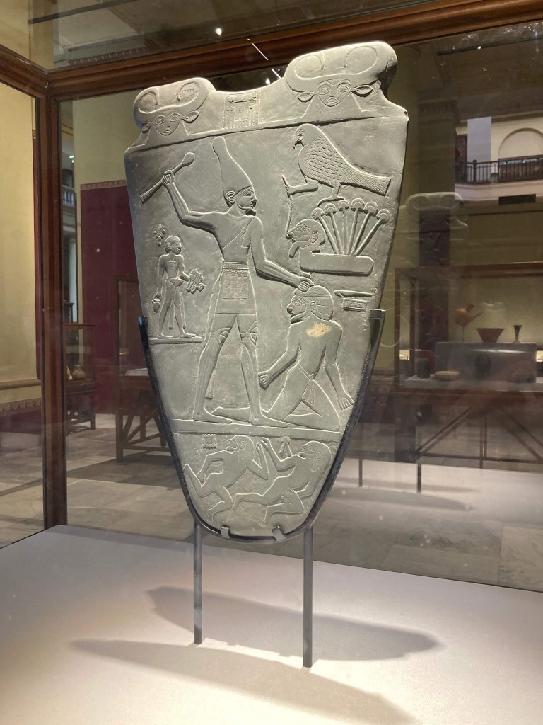 Paleta de Narmer – Descoberta em 1898 no Templo de Hórus, em Nekhen (Hieracompolis), capital do Alto Egipto na época pré-dinástica. Datada do século 31° a.C., é considerada a primeira obra de arte e o primeiro documento histórico do mundo e nela está representada a unificação do Alto e Baixo Egipto sob o governo do rei Narmer que, assim, tornou-se o primeiro rei do Egipto unificado e fundador da 1ª dinastia. Entre várias cenas, numa das faces Narmer aparece a usar a coroa branca do Alto Egipto (sul) e na outra a coroa vermelha do Baixo Egipto (norte) – juntas simbolizam a unificação das duas terras.