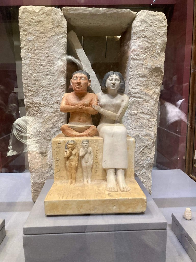 Estátua do anão Seneb e sua família – Encontrada na sua mastaba em Guiza, Seneb era o sacerdote funerário dos reis Khufu and Djedefra e também responsável pelo seu guarda-roupa. Mas a maior curiosidade desta estátua é podermos perceber como se relacionava um casal no Antigo Egipto – repare-se no gesto de afecto da sua mulher – e na posse típica das crianças – nuas e com o dedo na boca.