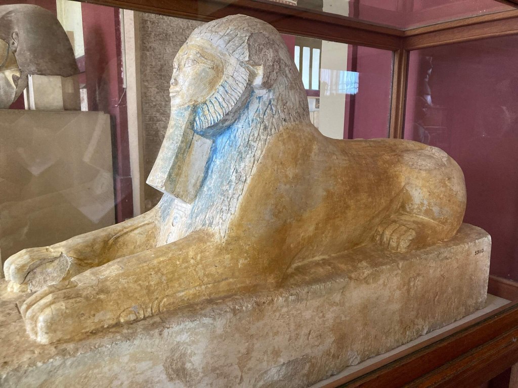 Esfinge de Hatchepsut – Em pedra calcário, nesta esfinge apenas o rosto tem forma humana, e não a cabeça toda. Este exemplo é um de dois que se pensa terem flanqueado a rampa entre os terraços do templo mortuário de Hatshepsut.
