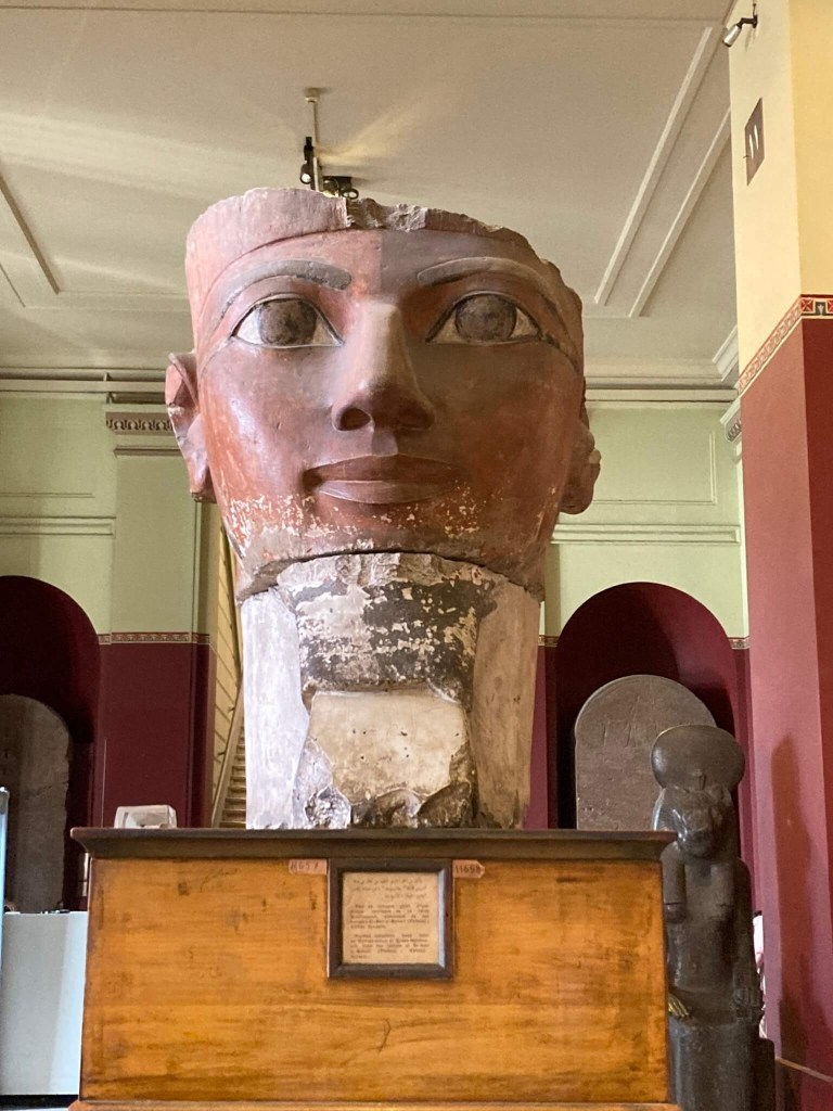 Cabeça de Hatchepsut – Uma das poucas mulheres faraó, Hatchepsut reinou entre 1473 e 1458 a.C. O seu sucessor, Tutmosis III, tentou apagar tudo o que lhe dizia respeito, como monumentos, estátuas, imagens e até o nome. Esta estátua escapou e estava diante dos pilares da colunada do seu templo mortuário em Deir el-Bahari, Luxor. Apesar da cabeça incompleta, percebe-se a coroa vermelha do Baixo Egipto.