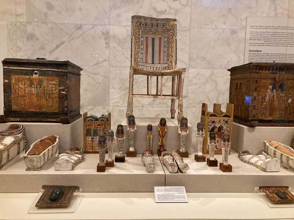 Ao longo do museu temos ainda a possibilidade de conhecer uma série de sarcófagos lindíssimos e incrivelmente decorados. Diante deles percebemos os relevos, cores, símbolos, rosto e até cabelo com materiais que parece cortiça. Uma delícia.