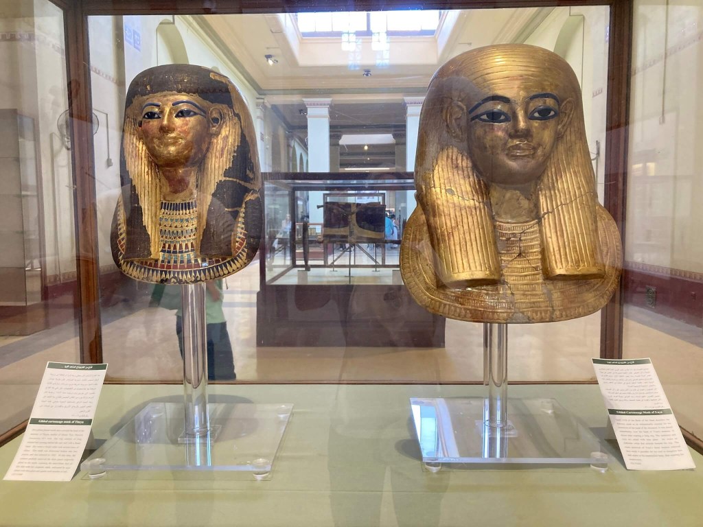 No dia 3 de Abril de 2021 o desfile “The Pharaohs’ Golden Parade” saiu do Museu Egípcio e atravessou as ruas do Cairo com 22 múmias de antigos reis egípcios até chegar ao seu novo destino no Museu Nacional da Civilização Egípcia. A exposição das múmias reais é, pois, o ponto alto da nossa visita e nela incluem-se as múmias de reis como Ramsés II, Seti I, Tutmosis III e a rainha Hatchepsut. A mumificação devia-se às crenças do Antigo Egipto de que depois da morte podia aceder-se a uma continuação da vida, sendo por isso os defuntos conservados da melhor maneira possível de forma a que pudessem habitar o corpo eternamente – se o corpo não fosse preservado intacto, a alma estaria condenada à busca vã e eterna do seu suporte físico. As técnicas foram mudando ao longo dos tempos, mas a mumificação ideal envolvia remover os órgãos internos como pulmões, fígado, intestinos, estômago e cérebro, para evitar a decomposição do corpo, sendo depois conservados nos vasos canopos. Durante um período de 70 dias o corpo era desidratado com natrão (uma mistura de sal e bicarbonato de sódio), ungido com óleos, ervas e resinas, e envolvido em faixas. E então encerrava-se o morto num sarcófago, acompanhado pelos seus bens mais preciosos e rodeado dos ditos vasos canopos. Foi a partir de 1881 que o Serviço de Antiguidades Egípcio começou a recuperar as múmias, caixões e objectos funerários e, ao trazê-los para o Cairo, os começou a estudar e mostrar. E o estudo destas múmias possibilitou o conhecimento sobre a dieta, doenças, crenças funerárias, economia, ciência e medicina dos antigos egípcios. As múmias dos reis do Império Novo são das mais perfeitas alguma vez feitas.