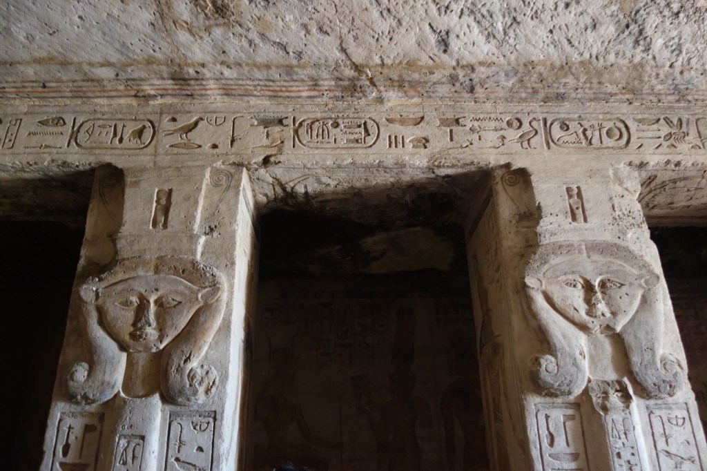 Após demoradamente nos deslumbrarmos com a magnificência e imponência desta fachada, entramos no templo e passamos a admirar o seu Grande Hall com 8 estátuas pouco menos colossais do mesmo Ramses II, agora representado na forma do deus Osiris. As paredes do templo estão decoradas com cenas militares onde o rei é mostrado vitorioso sobre os hititas na Batalha de Kaddish. E o tecto deste Grande Hall está decorado com figuras de falcões, simbolizando o Deus protector Nekbhet, e suportado por 8 colunas com estátuas de Ramsés II (sempre ele). E as outras salas têm decorações de cenas rituais do rei e vários deuses, com Ramsés II e Nefertari frente a deuses e a barcas solares. Já no santuário sagrado vê-se Ramsés II e uma tríade de deuses sentados no trono.