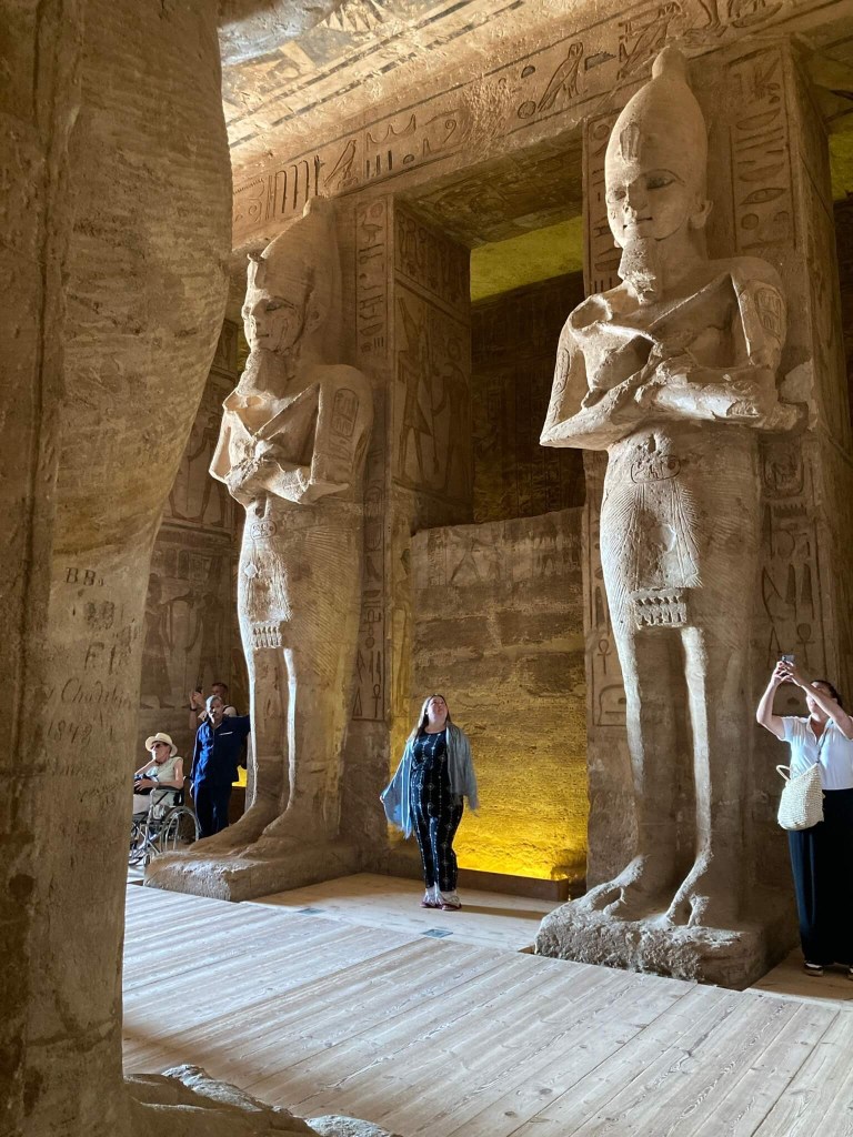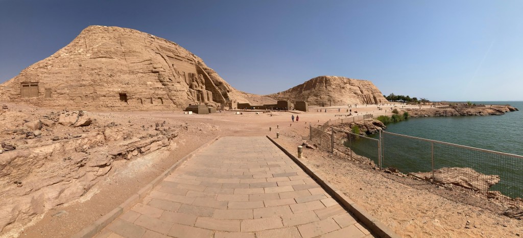 A entrada é monumental, com o Nilo transformado em novo Lago Nasser e duas enormes montanhas à sua beira, cada uma com a fachada escavada e decorada directamente na rocha com as ditas estátuas de Ramsés II.