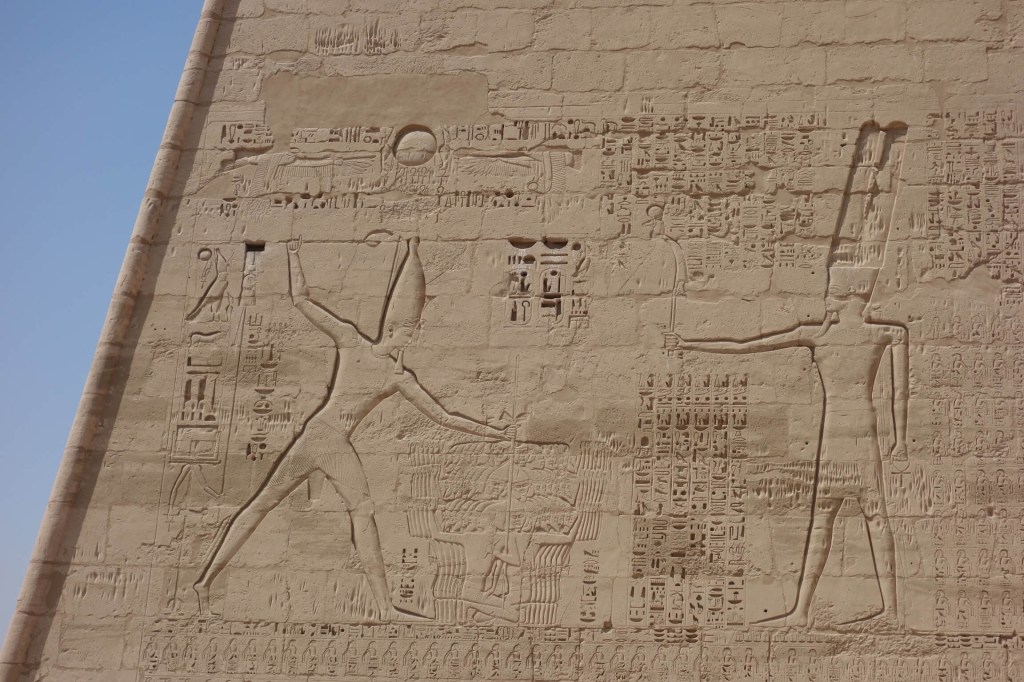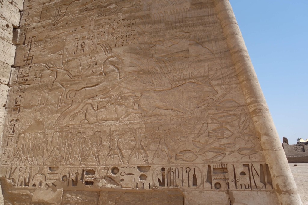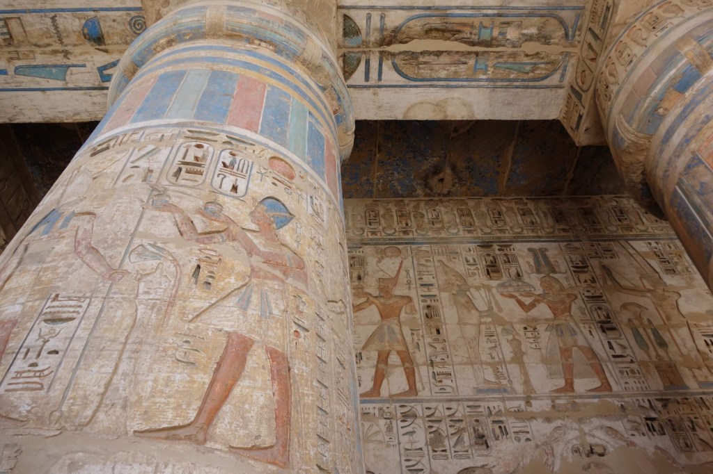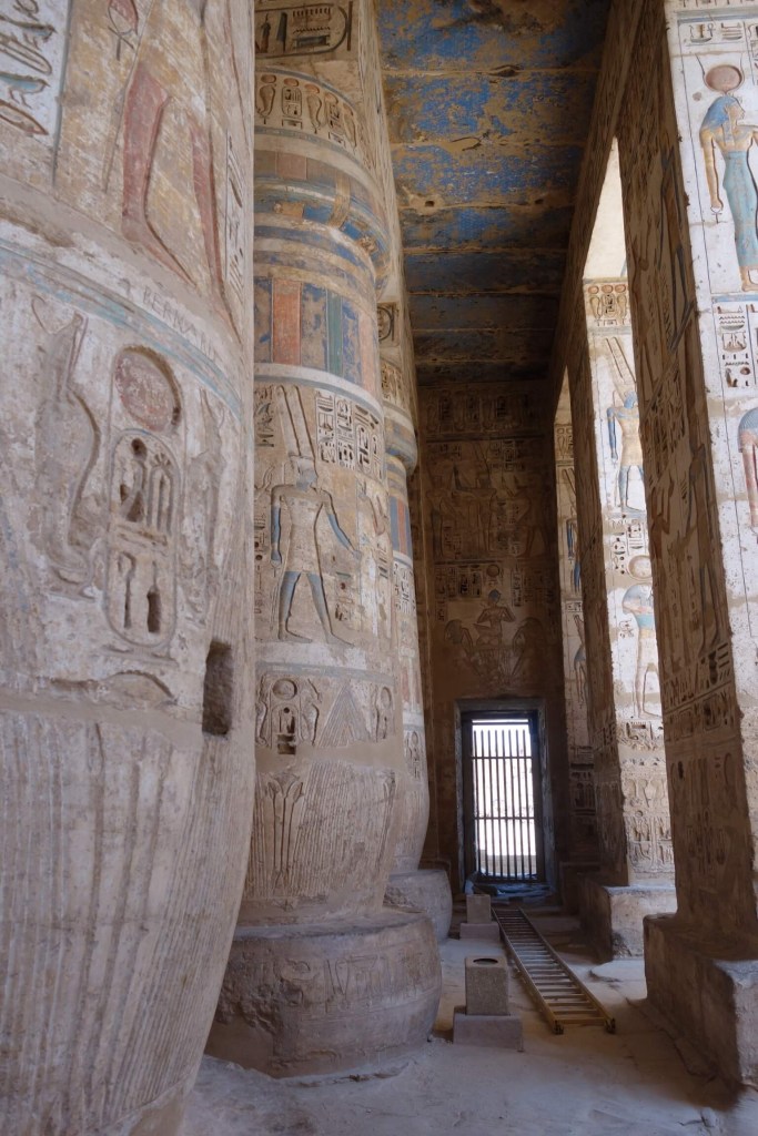 Não muito distante fica o Templo de Medinat Habu, o templo funerário de Ramses III (dono do primeiro túmulo do Vale dos Reis que visitámos). Não tão visitado, é um dos mais fantásticos de Luxor, não comparável com Karnak em termos de escala, mas seguramente comparável na cor e motivos da decoração das colunas da sua Sala Hipostila. Muitas pinturas de monumentos, inclusive ao ar livre, sobreviveram milhares de anos e tal deve-se sobretudo aos antigos egípcios usarem pigmentos naturais que não só davam as cores vivas como eram muito permanentes. No caso deste Templo de Medinat Habu isso é muito evidente. E é delicioso constatar as imagens dos egípcios aqui, introduzindo novidades nas vestes e lançando moda.