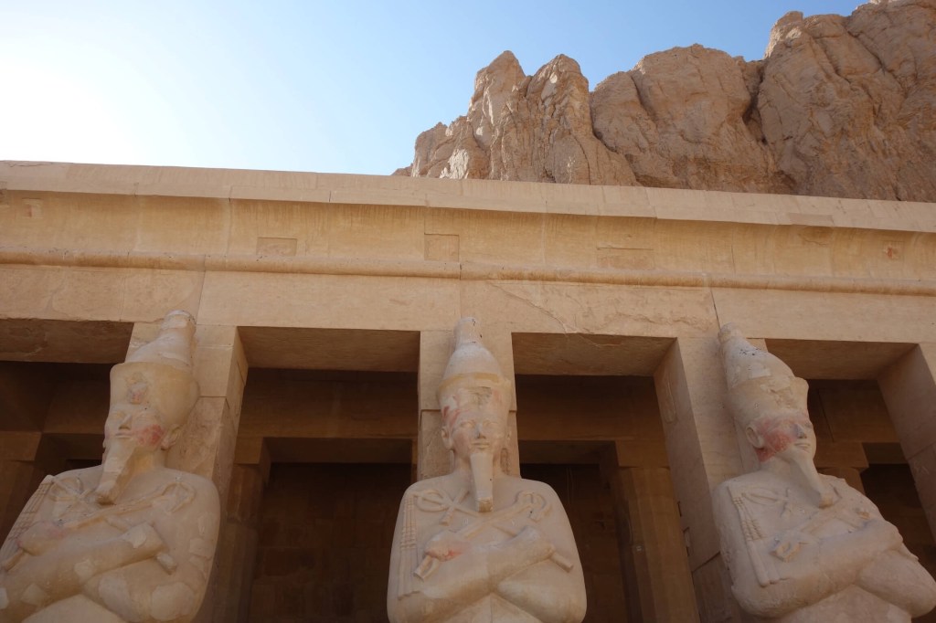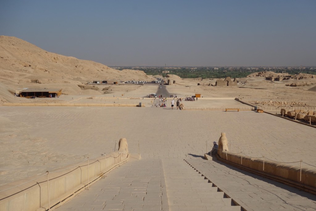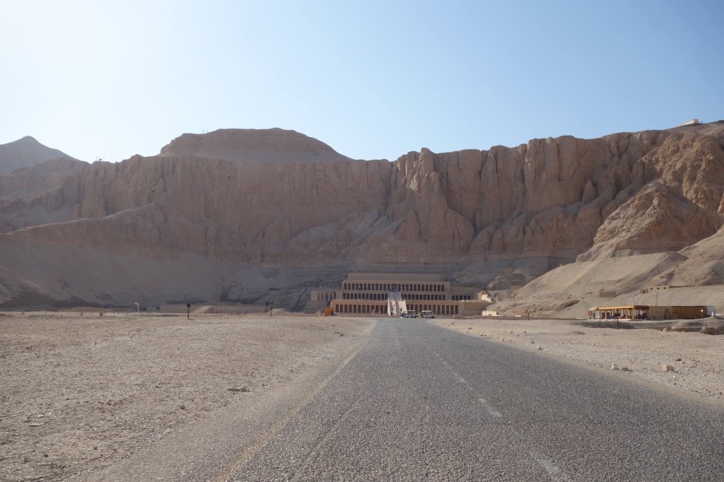 O último lugar visitado nesta margem ocidental de Luxor foi o Templo Deir el-Bahari, erguido em honra de Hatchepsut. O cenário natural é majestoso e a sucessão de terraços e pórticos unidos por rampas que é a imagem de marca deste templo faz dele um dos mais imponentes. Deir el-Bahari, o lugar, já era espaço sagrado (há muito consagrado à deusa Hathor, protectora dos defuntos, e já Mentuhotep II no Império Médio havia aqui erigido um templo funerário), mas com a implantação deste templo ficou definitivamente conhecido como o mais sagrado dos templos sagrados. Tem um desenho diferente dos demais, sobretudo por se adaptar de forma magistral ao terreno.