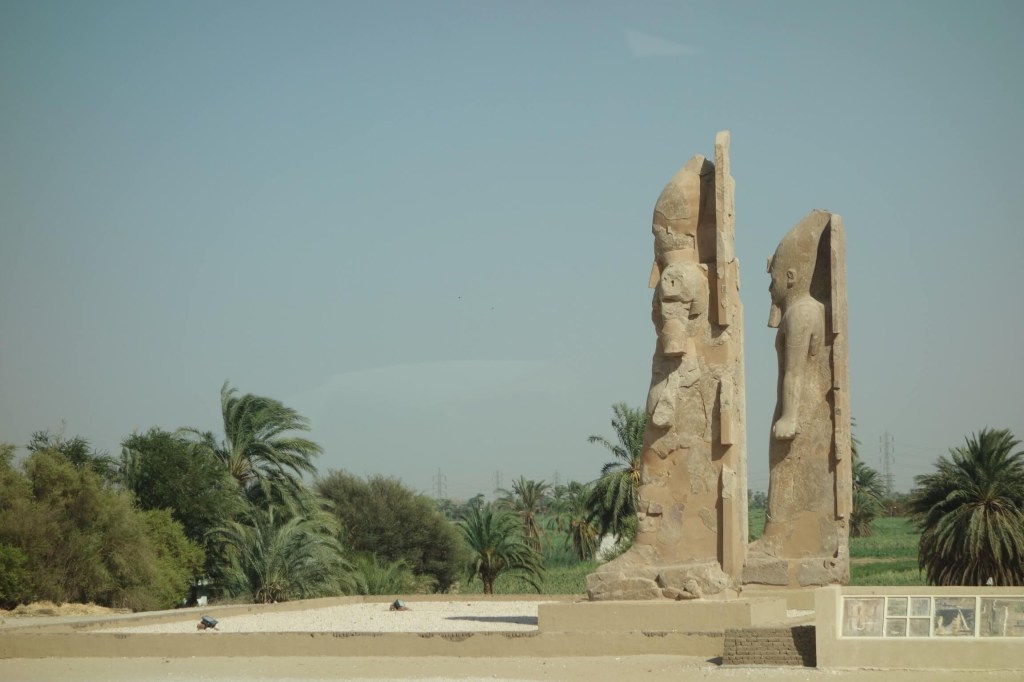 Mas antes destes túmulos passámos, à semelhança do que acontece com todos os visitantes da margem ocidental de Luxor, pelos Colossos de Memnon. São duas enormes estátuas, com 18 metros, que representam o faraó Amenhotep III e estão numa das entradas do seu templo funerário, o maior do Egipto. Os trabalhos arqueológicos estão em curso e terá sido por aqui que foi encontrada a estátua colossal deste rei e sua Tiye que vimos no Museu Egípcio, no Cairo. Os Colossos de Memnon já eram uma atracção nos tempos greco-romanos no Egipto e então estas estátuas eram atribuídas a Memnon, o lendário rei africano que foi morto por Aquiles na Guerra de Tróia. Ficou o nome.