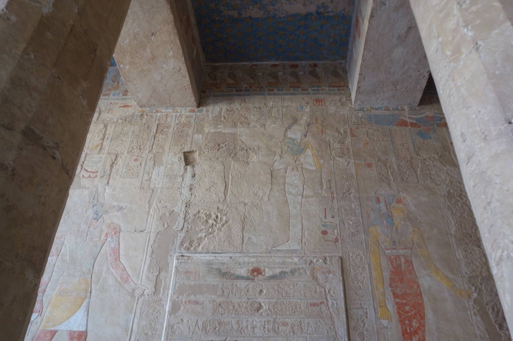 Na época, os muros e pátios estariam cheios de cor, com jardins, tanques, esculturas e relevos, mas hoje estão quase despidos. Restam alguns relevos e as capelas dedicadas a Hathor e a Anubis.