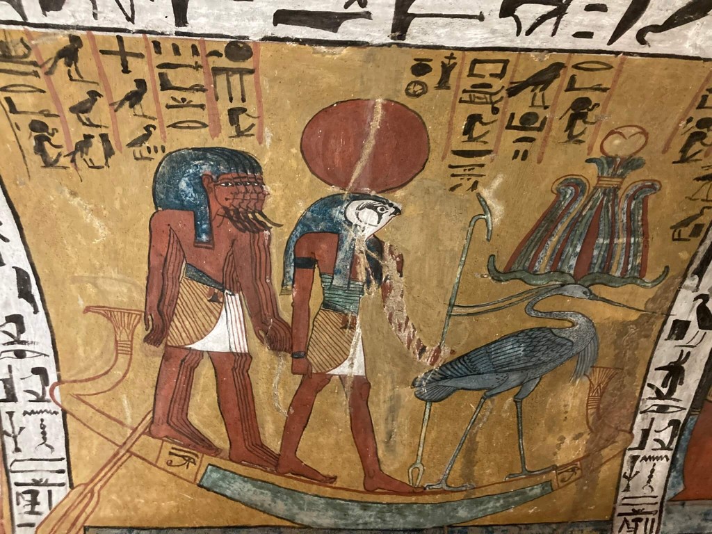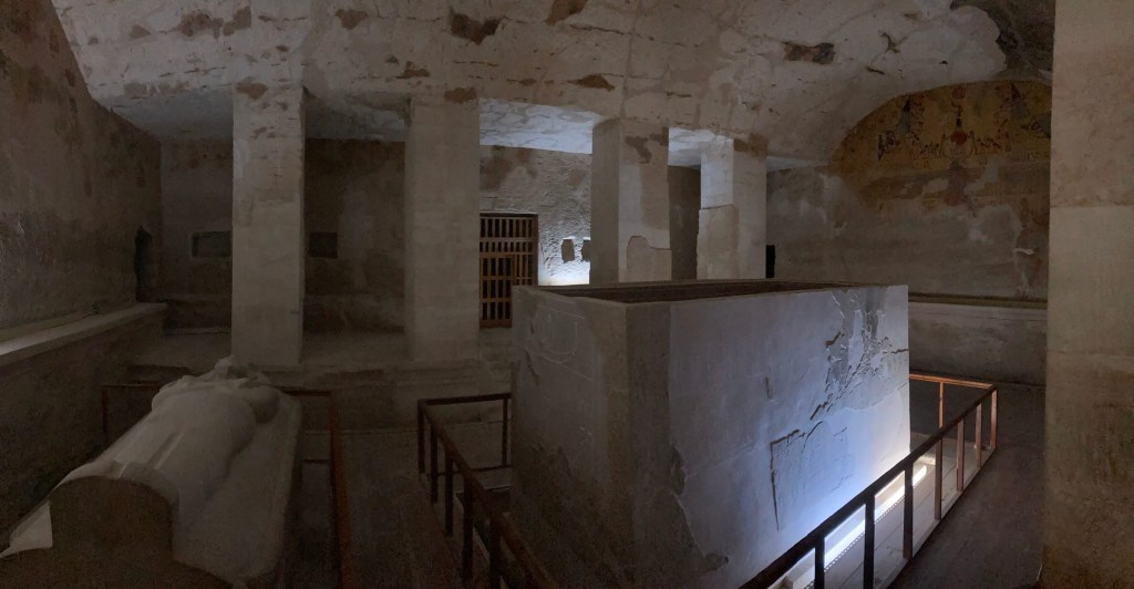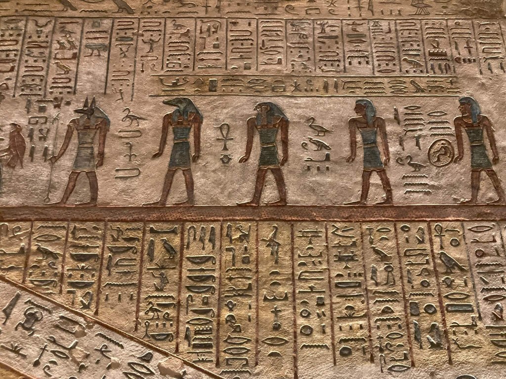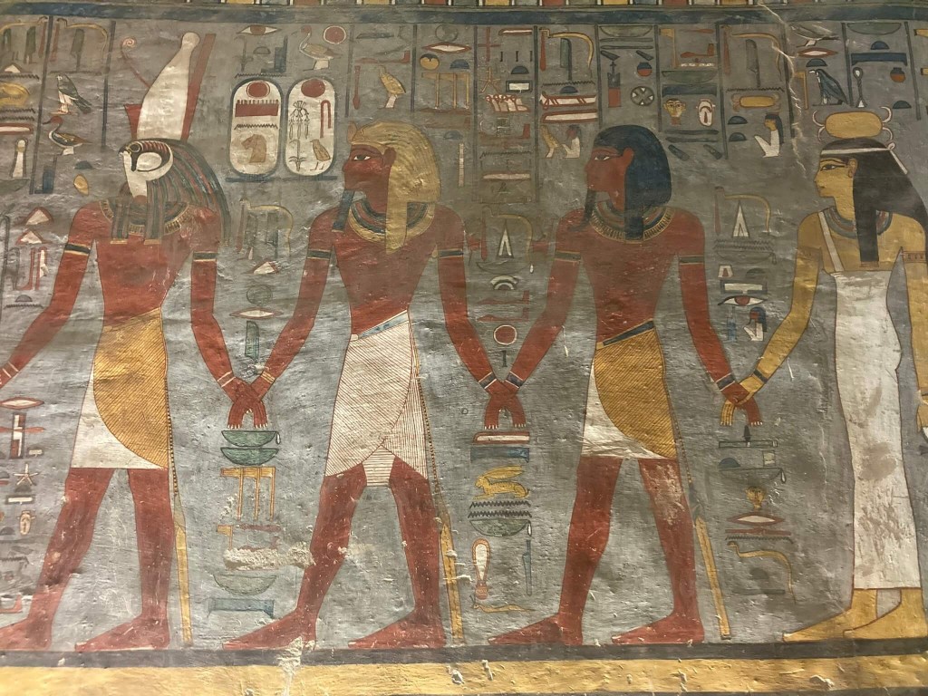 Seguindo o conselho da nossa guia egípcia, acabámos por visitar os túmulos de Ramsés III – KV11, de Ramses I – KV16 e de Merenptah – KV8. A montanha árida onde foram escavados impressiona e quando a adentramos todo um novo mundo se nos revela. Desconhecia-se – e desconhece-se – como era a vida no além, pelo que a imaginação é que comandava as operações de decoração destes lugares. Todos os túmulos estão decorados – a decoração serviria de modelo ee são maravilhosos. E é inacreditável como tanta cor foi capaz de chegar ao nosso tempo. A construção e a decoração destes túmulos tinha início e prosseguia em vida do rei, mas não terminavam até o rei morrer, uma vez que considerava-se que tal trazia má sorte.