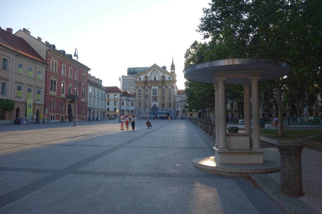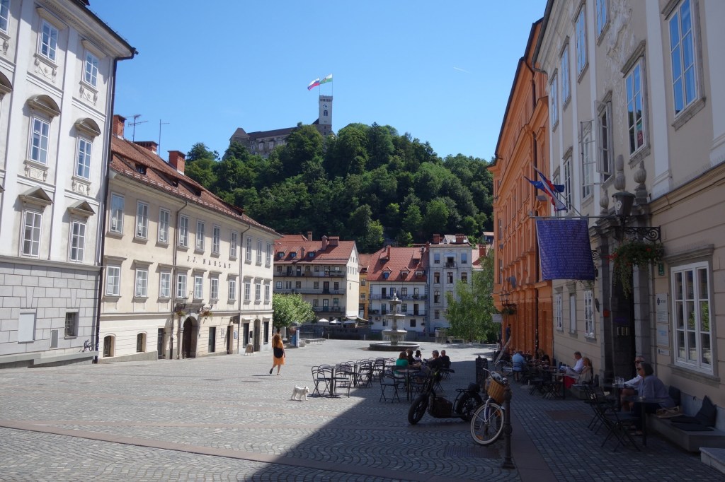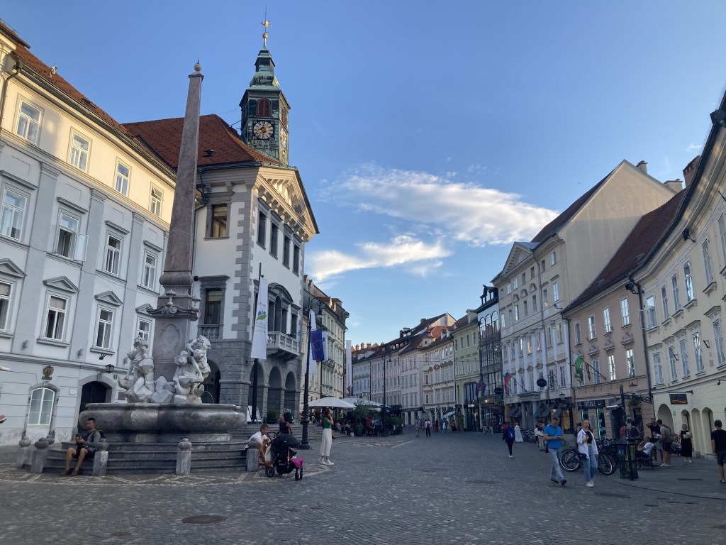 O prazer de caminhar pelas ruas estreitas deste centro histórico pedonal e compacto não é menor do que fazê-lo com a companhia do rio. Cheio de esplanadas, restaurantes e lojinhas, passamos pelo edifício da Câmara Municipal e sua praça (Mestni trg) para, pouco depois, desembocarmos em nova praça acolhedora (Stari trg). Este é o coração de Lubliana.