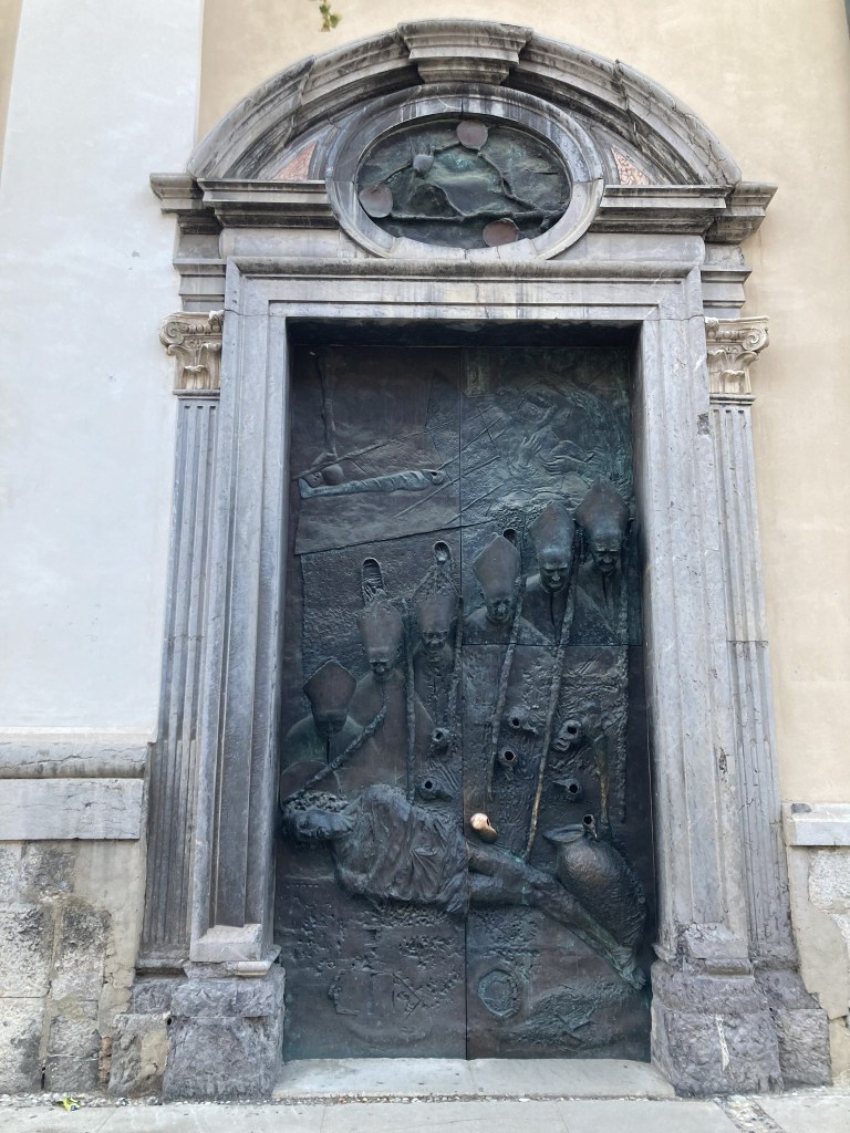 A Catedral de São Nicolau está logo ali, com as suas portas belamente esculpidas em bronze.