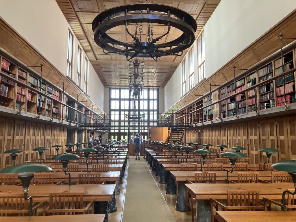 E se subimos, agora teremos de descer. Mas Plečnik criou como que uma ligação simbólica entre o Castelo e o Parque Tivoli, do outro lado do rio, passado por diversos edifícios públicos. O mais excepcional deles é o da Biblioteca Nacional e Universitária, para muitos a obra-prima de Plečnik e da arquitectura eslovena. A fachada é uma junção de tijolo e pedra muito cénica, mas é o seu interior que arrebata. Uma escadaria com colunas monumentais em pedra local parece transportar-nos para um lugar religioso ou místico, mas essa austeridade que não intimida transforma-se na sala de leitura num ambiente totalmente acolhedor.