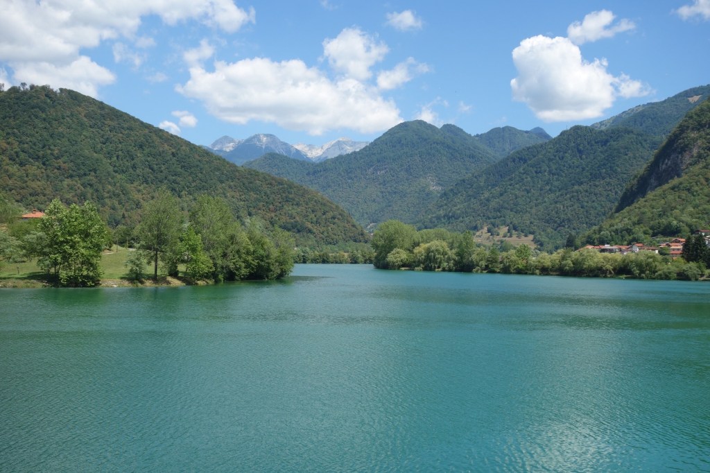 Já fora dos limites do PN Triglav, mas ainda ao longo do rio Soča, há duas povoações que merecem uma paragem. Primeiro, Most na Soci, um lugar tornado idílico a partir de 1938 com a construção de uma barragem para onde confluem as águas dos rios Soča e Idrijca. Pode ser uma paisagem criada artificialmente, mas ninguém rouba toda a beleza deste lago com montanhas à sua volta.