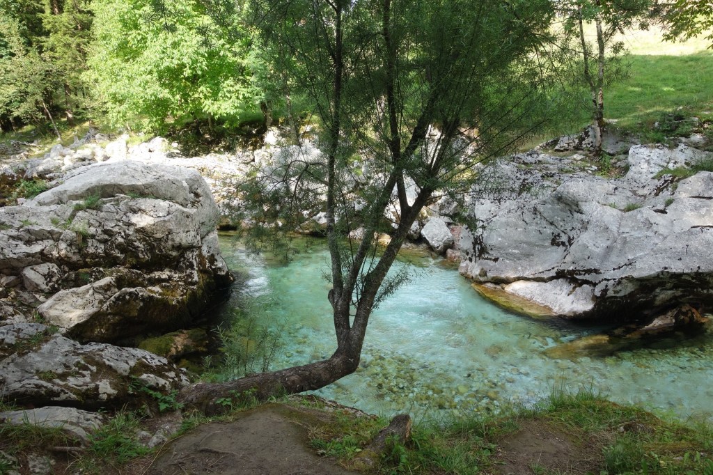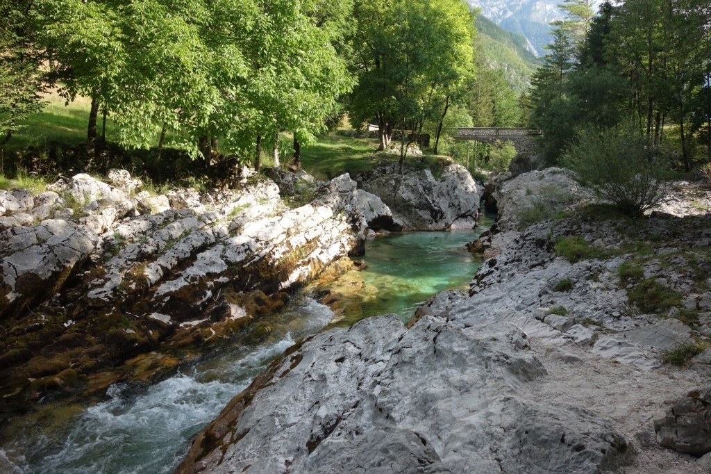Iniciámos o percurso de 15 kms em Vas na Skali, junto ao Kamp Jelinc e ao Kamp Korita, e terminámos “oficialmente” no Kamp Liza, seguindo depois pouco mais para Bovec. Há uma série de parques de campismo ao longo do rio, pelo que não faltam possibilidades de alojamento caso se opte por um percurso mais extenso (oficialmente o Soča Trail tem 25 kms, mas há que acrescentar mais alguns para se chegar ao ponto de partida, na sua nascente em Izviru Soce, e ao ponto de chegada, em Bovec). Não é um percurso difícil, praticamente sempre plano e sem desníveis acentuados, mas pode ser algo cansativo por haver muita pedra e raiz de árvore para calcar. Dito isto, qual é então o interesse deste rio?