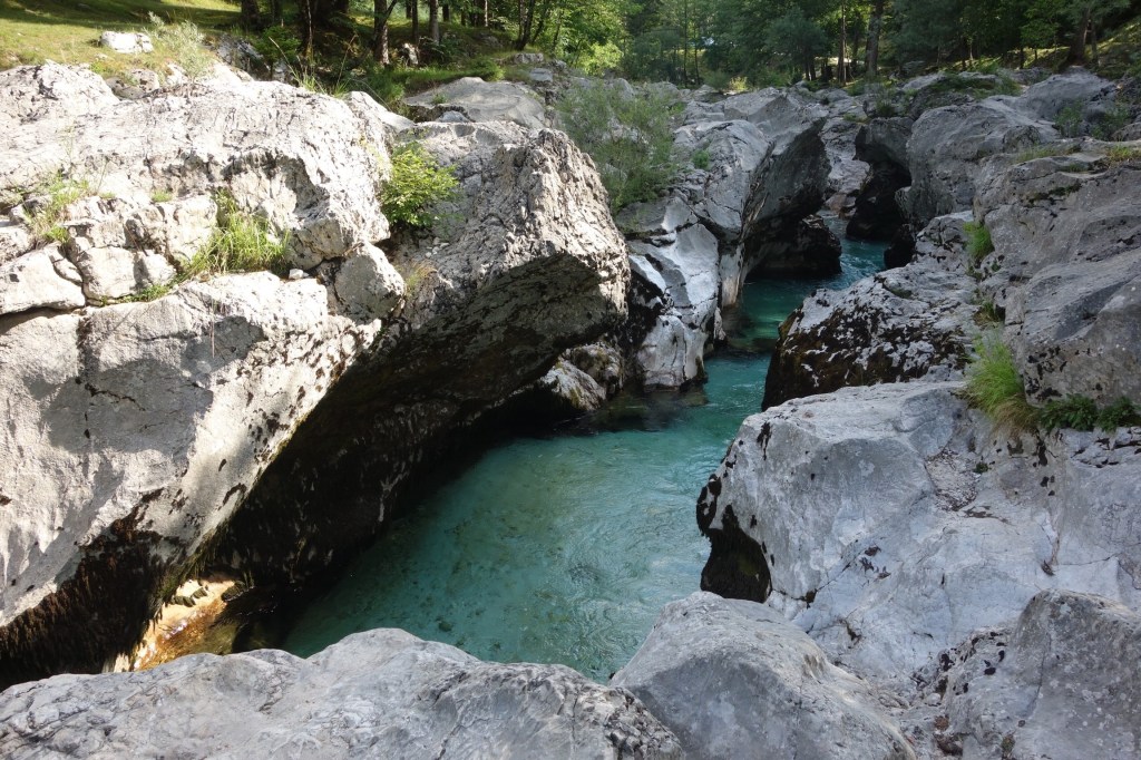 O Soča é um rio que nasce no Vale de Trenta (Eslovénia) e desagua em Monfalcone (Itália), num caminho total de 138 kms desde os Alpes até ao Adriático. Tem o maior número e as mais características cavidades em vale de rio da Eslovénia. Logo junto aos Kamp Jelinc e Korita temos uns belos exemplos do “pequeno desfiladeiro do Soča”, umas cavidades rasas e estreitas por onde a água incrivelmente azul-esmeralda do rio vai correndo. Mais adiante, imediatamente antes de chegar ao Kamp Soča encontramos “o grande desfiladeiro do Soča”, umas cavidades igualmente estreitas mas agora com umas paredes rochosas muito altas, num declive abrupto e a pique rio abaixo. Ambas são extremamente pitorescas, delicadas as primeiras, assombrosas as segundas. As mais estreitas têm menos de 2 metros e as mais largas 7 ou 8 metros de largura; as mais altas chegam a ter 10 a 15 metros de altura; e a profundidade da água do rio depende da época do ano, chegando aos 3 metros na época seca e indo até ao topo – ou transbordando, até – na época de chuvas fortes.