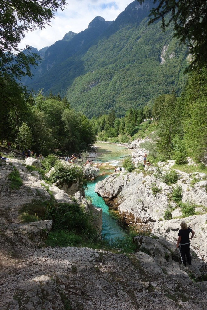 Durante o trilho o Soča alterna entre momentos mais sofridos e outros mais tranquilos, onde o rio alarga e o vale abre, deixando que as enormes montanhas entrem na imagem. Há várias possibilidades de paragem para um “mergulho” – e ao longo do caminho vêem-se vários pescadores com os pés na água -, mas há que ter cautela, uma vez que a corrente é forte, chegando a atingir os 30 kms por hora nas épocas de maior torrente. Não foi o caso que nos tocou, mas ainda assim, quando entrámos na água no lugar logo após o “grande desfiladeiro” tivemos duas surpresas: a água fresca que quase imobiliza os pés e a necessidade de logo agarrar uma das rochas para não seguirmos com a corrente. No entanto, não deve ser nada de especial, já que um rapaz local se divertia a saltar de uma pequena rocha com a filha de 3 anos ao colo. De qualquer forma, acabei por não me aventurar a nadar na passagem estreitíssima e azulíssima desde spot que desejava desde que a mirei desde cima.