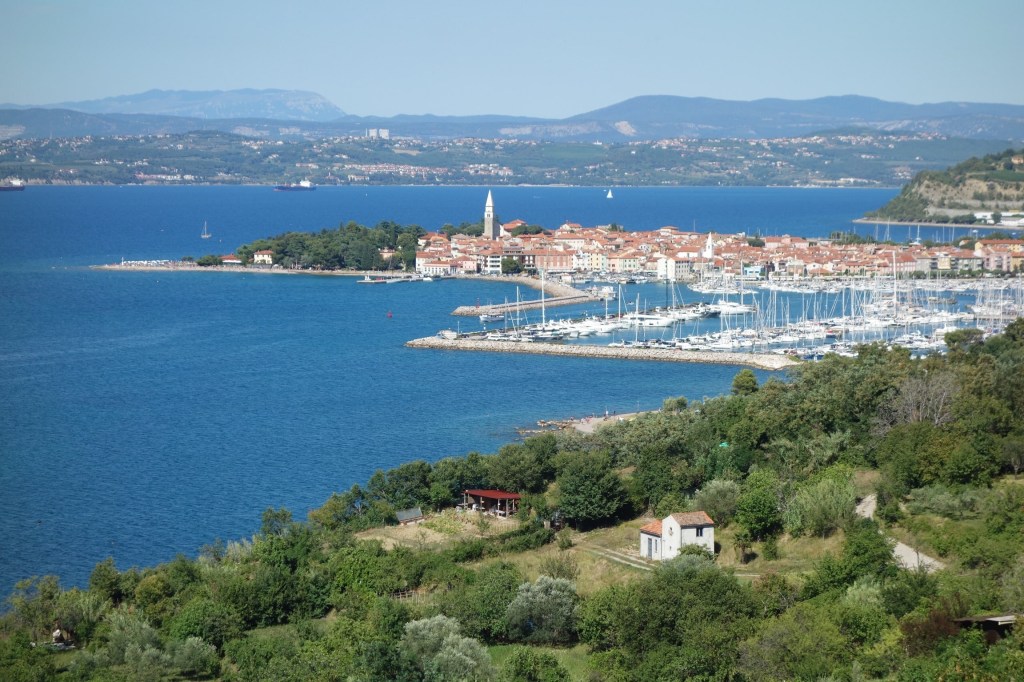 No que respeita a panoramas, há dois que são obrigatórios. A subida à torre da Igreja São Jorge deixa-nos sobre o centro histórico de Piran, ideal para perceber na perfeição o tal emaranhado de ruas e edifícios, vemos agora que de telhados vermelhos, e a forma ovalada praça principal, cujos detalhes nos seriam revelados daí a pouco. Tudo isto acompanhado por um mar de um azul fascinante e de uma surpreendente e generosa área verde de floresta. O encanto de Piran vem não apenas do seu conjunto edificado, mas também da sua localização à beira mar rodeada de montes – a ondulação em terra só baixa, precisamente, à chegada a Piran. Alias, entre Piran e Izola temos o Parque Natural de Strunjan, no alto de uma falésia dito “uma floresta a caminho do mar”.