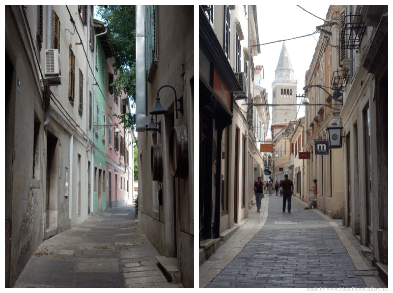 Resta mais um centro histórico bem conservado que guarda uma série de ruas pitorescas e uma praça principal monumental. A Titov Trg para os eslovenos é a Piazza del Duomo para os italianos – os nomes das ruas têm placas em ambos os idiomas – e nela ficam os edifícios mais importantes. Desde logo, a Catedral de Koper com a característica torre de fortificação romanesca do século 12. O seu sino é de 1333, o mais antigo em funcionamento na Eslovénia. E, depois, o Palácio Praetorian com a sua arquitectura que mescla os estilos gótico veneziano e renascentista. As ruas da cidade deixam ver alguns palacetes de arquitectura algo discreta, ao passo que desembocam em pracinhas ou em becos. E não é improvável darmos com uma latada de videira em pleno centro histórico. Cidade portuária, o porto está lado a lado com a praia e esta com a marina, enquanto Itália é já do outro lado.