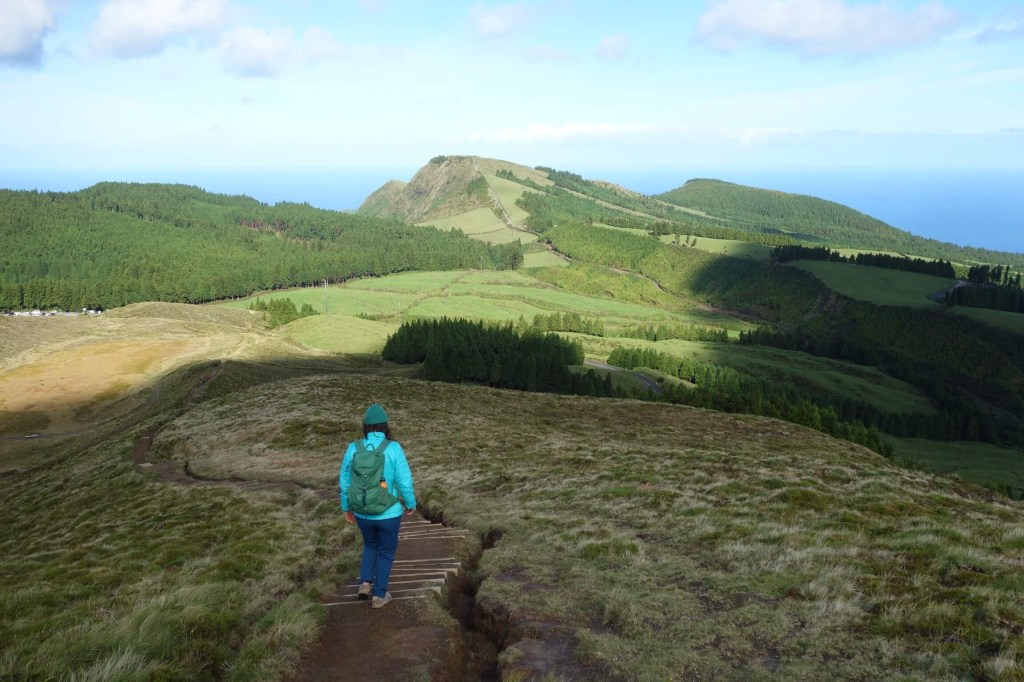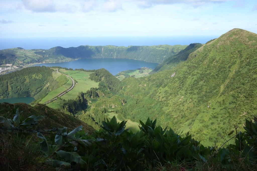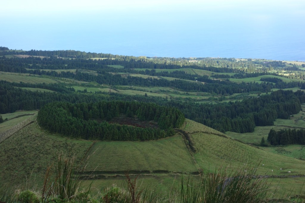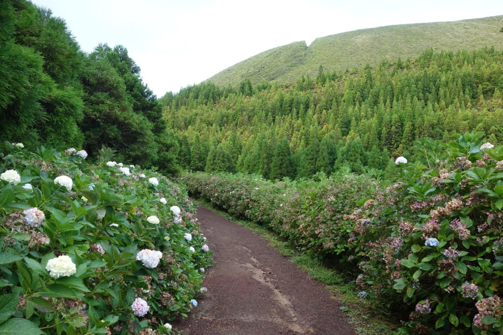 Um desvio até ao miradouro do Pico do Paul, num belo caminho ladeado por hortênsias e com o Pico das Éguas sob mira, ao qual em breve também subiremos, dá-nos uma das mais incríveis vistas de todo o percurso. Apesar de não ser tão aberta para a costa sul como aquela que vemos desde o miradouro do Pico do Carvão (na estrada de acesso às Sete Cidades), precisamente porque temos este monte a tapá-la em parte, traz-nos muitos novos elementos: mais cristas vulcânicas, o Aqueduto do Carvão, o próprio Pico do Carvão e sua lagoa e o cone vulcânico com a lagoa do Pau Pique, todos nas imediações próximas. E a tal vista para a costa norte e maciço montanhoso central da ilha, incluindo Pico da Vara e Vulcão do Fogo.