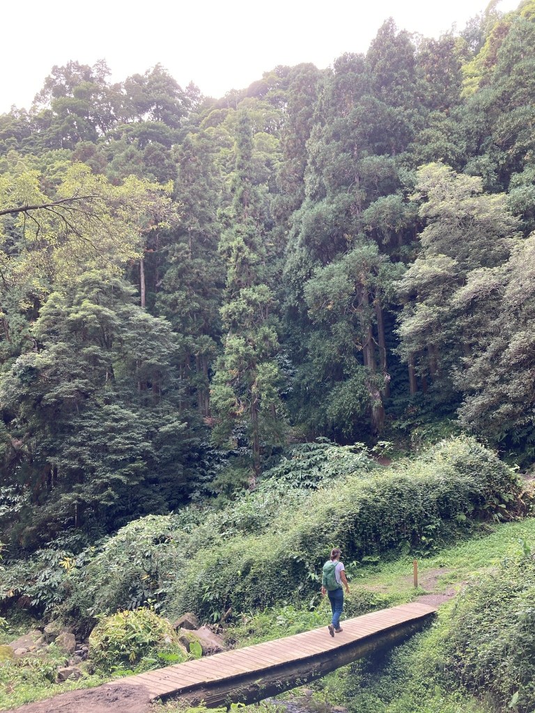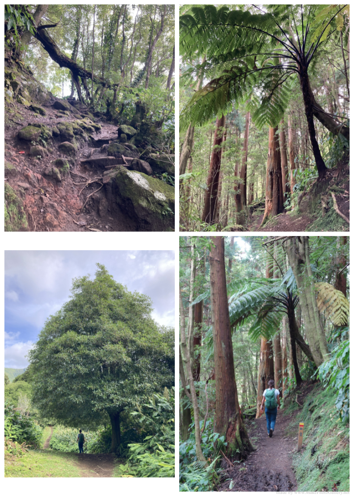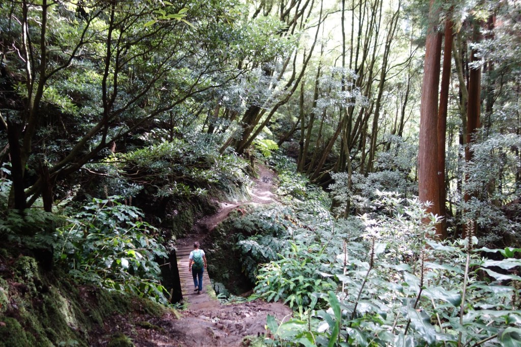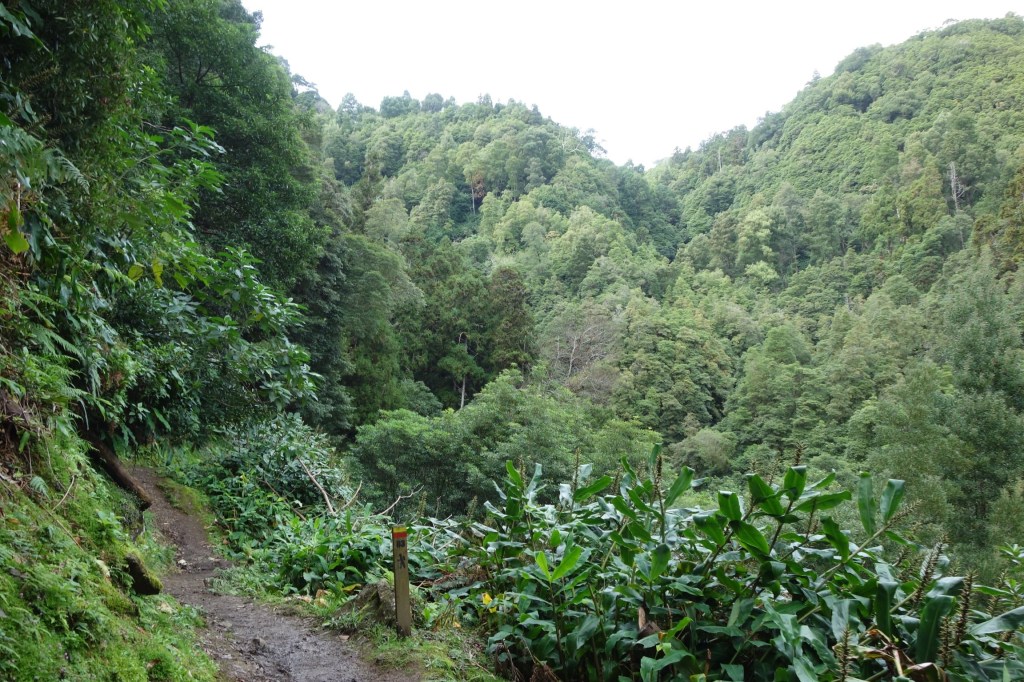 Deixando o mar nas costas (o Faial da Terra chegou a ser a mais importante zona baleeira do sul da ilha de São Miguel), começámos por subir vale afora, sempre acompanhadas pela Ribeira do Faial da Terra. Vêem-se terrenos de culturas várias, como folhas de tabaco e milho, árvores de fruto como laranjas azedas, mas são o incenso (também conhecido como faia do norte) e a acácia que dominam. Há também conteiras.