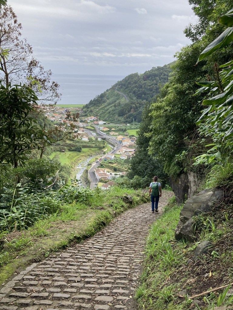 É para lá que vamos, descendo a panorâmica calçada de pedra em ziguezague, acompanhada de bananeiras e muito mais vegetação. Já não há sanguinho, a espécie que deu o nome à aldeia, mas não faz mal. Sobram muitas outras espécies e paisagens que nos farão ter saudades deste pedaço exuberante dos Açores.