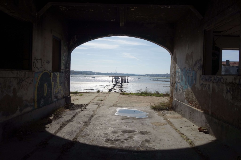 O edifício da Companhia Atlântica tem um género de praia privativa à sua beira e o belo Seixal mesmo diante si. E está rodeado de moinhos de maré, o Moinho do Capitão à direita e o Moinho da Passagem à esquerda, este último de acesso difícil pelo muito lodo. E ainda anda por aqui perdido algures o Moinho do Galvão.