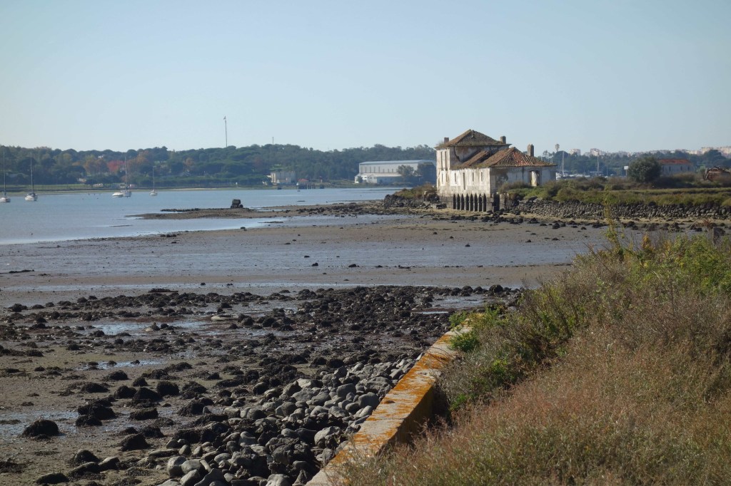 Apesar da estrada, decidimos seguir a caminhar desde o Moinho da Maré de Corroios, parte do Ecomuseu Municipal do Seixal. Edificado em 1403 por iniciativa do Santo Condestável Nuno Álvares Pereira, é um exemplo do aproveitamento da energia das marés, cuja aplicação à actividade moageira se generalizou entre os séculos XV a XIX no estuário do Tejo. Só aqui estão documentados 45 moinhos, 13 dos quais na área do concelho do Seixal, tendo desempenhado um papel importante na produção de farinhas que abastecia as populações locais e Lisboa. Estavam implantados em locais abrigados, como estuários, esteiros ou áreas de sapal, e os moinhos de maré permitiam um rendimento mais elevado relativamente às azenhas ou moinhos de vento. Com efeito, ao contrário destes, não dependiam nem da intensidade do vento nem do caudal dos cursos de água, conseguindo assim um funcionamento regular durante todo o ano, numa média de oito horas por dia, acompanhando o movimento cíclico das marés. A laboração do moinho estava, pois, dependente das marés, sendo a caldeira abastecida na enchente da maré através da comporta, que se fechava na vazante, retendo a água no interior do reservatório. A água era então direccionada para os rodízios, colocando-os em movimento. Depois, através de um sistema de engrenagens existente sob a bancada de moagem a energia hidráulica convertia-se em energia mecânica, accionando a mó superior de cada engenho de moagem e assim se procedendo à transformação do cereal em farinha.