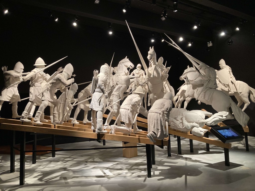 O espaço expositivo, em si, inicia-se com a reprodução em tamanho real do fresco de Martins Barata representando a Batalha de Atoleiros, cujo original decora a sala de audiências do Tribunal de Fronteira, aqui perto. Segue-se a contextualização histórica do período, uma época de diversas crises (religiosa, pelo cisma, social, pela peste, e dinástica, pela morte de D. Fernando), dando a conhecer diferentes perspectivas dos acontecimentos. Com recurso ao multimedia, é visualizado um vídeo com a recriação da Batalha e esta é representada por uma escultura em grande escala com ambos os exércitos em acção. O resto é história: em 1383 morreu D. Fernando e sua filha D. Beatriz, que havia casado com o rei de Castela, foi aclamada rainha; entre 1383 e 1385 travaram-se várias batalhas, culminando na decisiva Aljubarrota, em 1385, e D. João Mestre de Avis foi aclamado rei. Pelo meio, a Batalha de Atoleiros fez emergir um personagem que mais tarde foi tornado condestável, D. Nuno Álvares Pereira, que neste pedaço da planície alentejana guiou as tropas portuguesas à vitória sobre as castelhanas, utilizando pela primeira vez a táctica do quadrado e o uso de lanceiros. E abrindo caminho para que Fronteira fosse não apenas território português, mas também parte importante da nossa história.