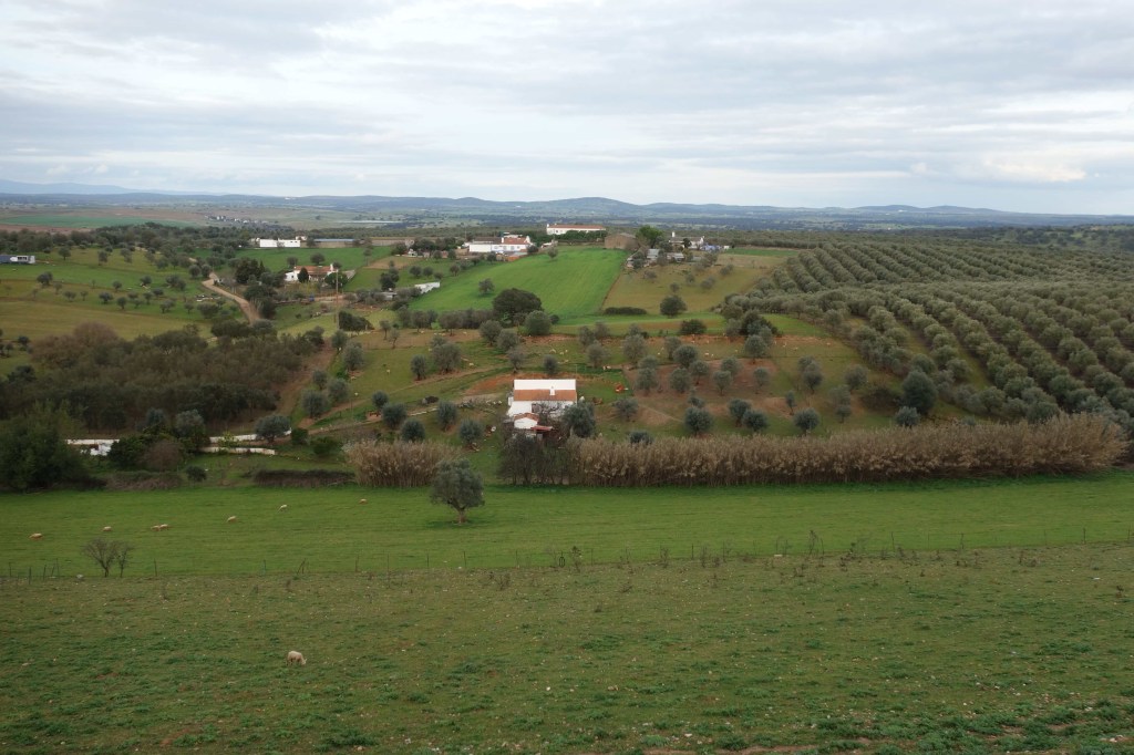 A própria vila de Fronteira está instalada num monte pouco pronunciado, a 250 metros de altitude, rodeado pela planície alentejana onde domina o olival, mas também a horta e o pomar. Paisagem tranquila, já se vê, deixando ao longe os relevos mais acentuados da Serra de São Mamede.