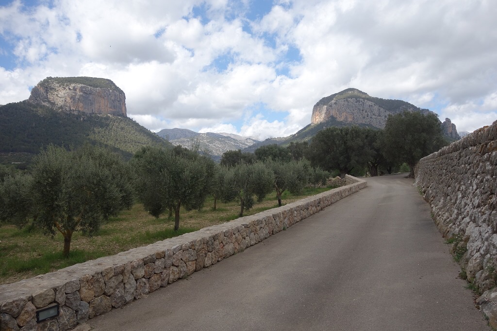 Já cá em baixo, na estrada, nova vista para ambos os montes, Puig d’ Alaró e Puig de s’ Alcadena, desta vez irmanados e, vemos agora, de silhueta similar.